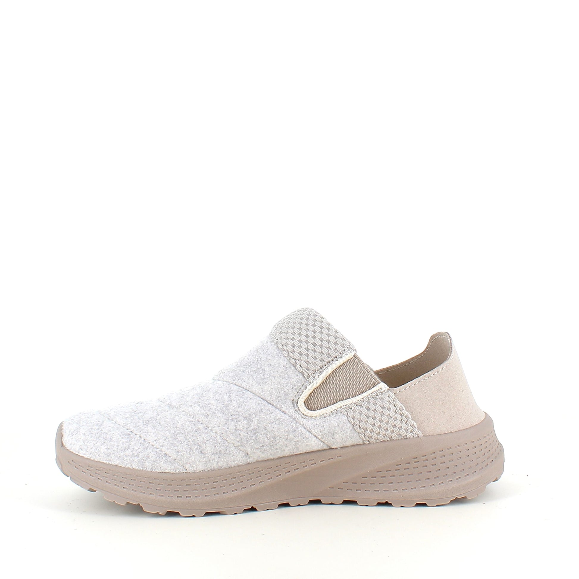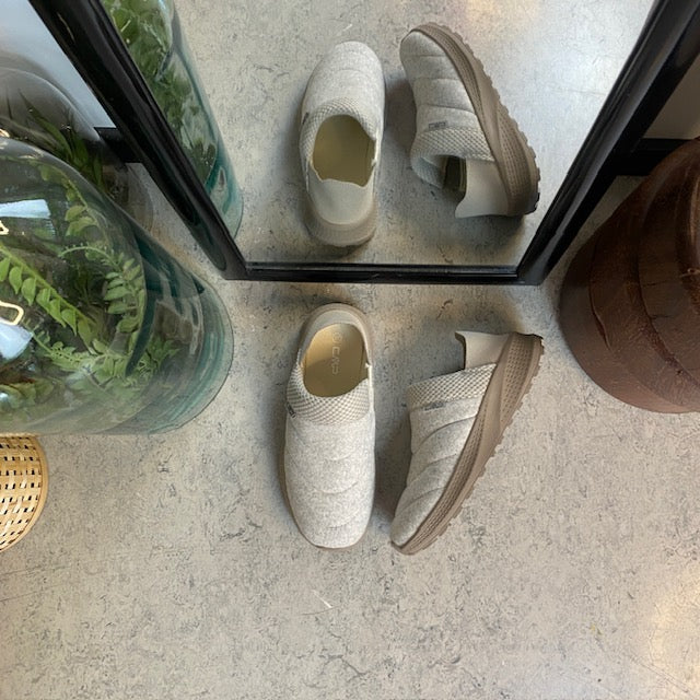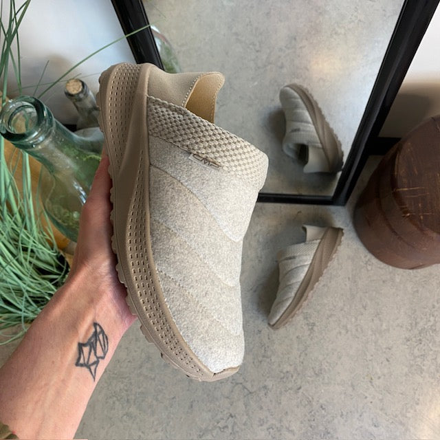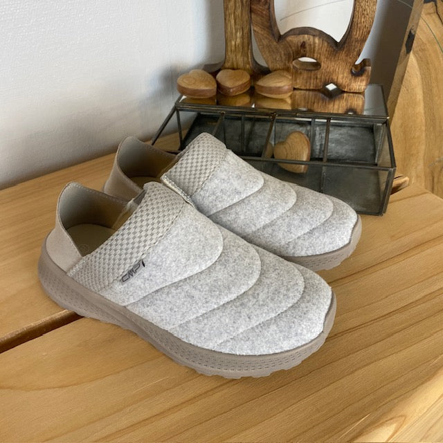 Hjemmeskoen er lavet i blødt, gråt filt og giver en behagelig, varm og fleksibel pasform.