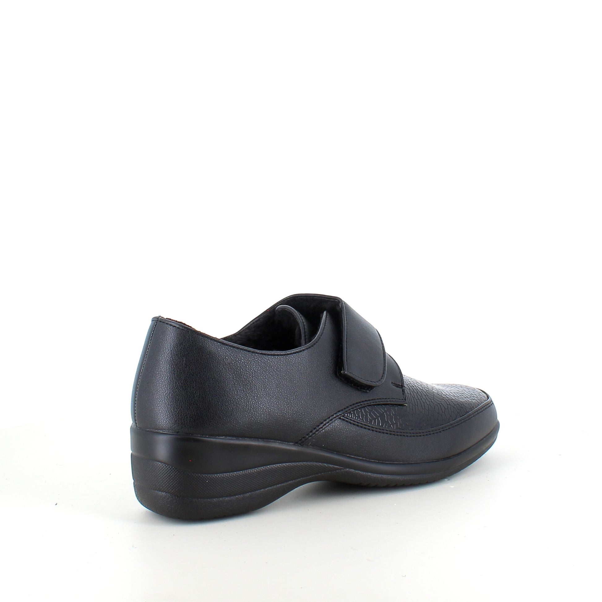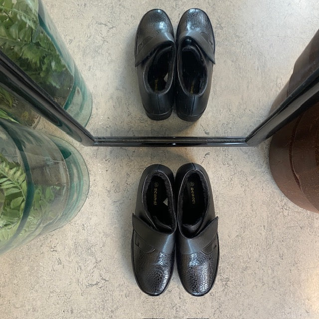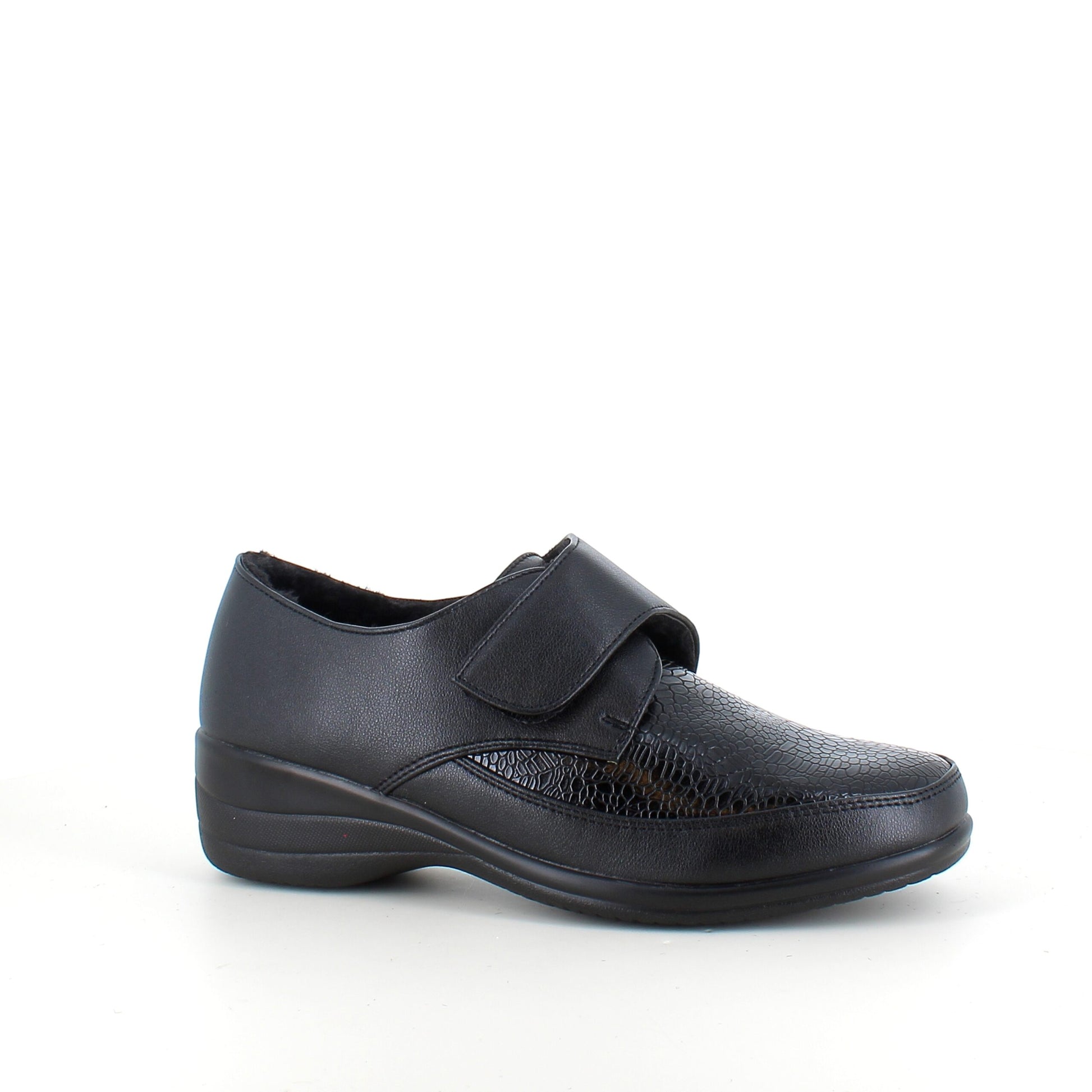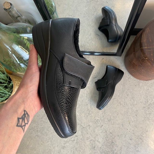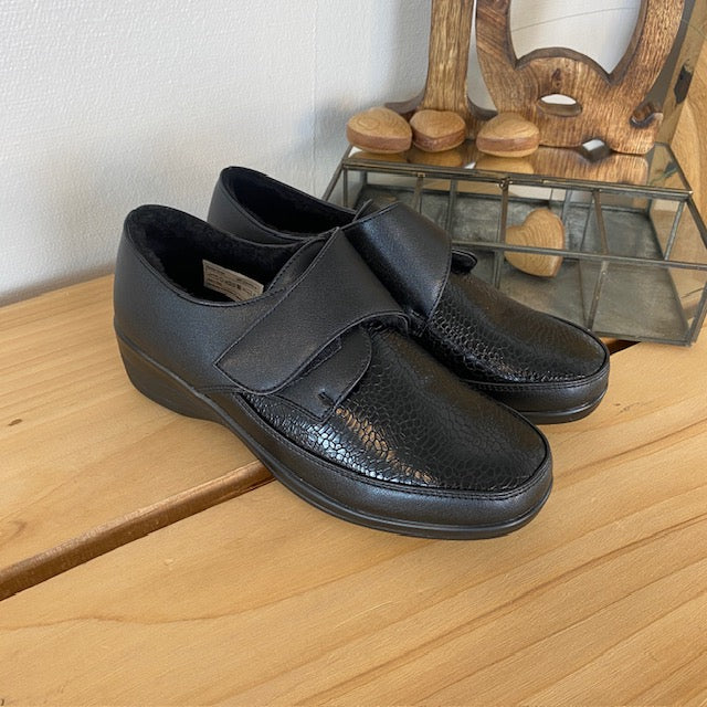 Overdelen er detaljeret med et elegant slangemønster, der giver et moderne look, mens den brede velcrolukning gør skoen nem at få af og på – også for dig, der har brug for ekstra rummelighed.