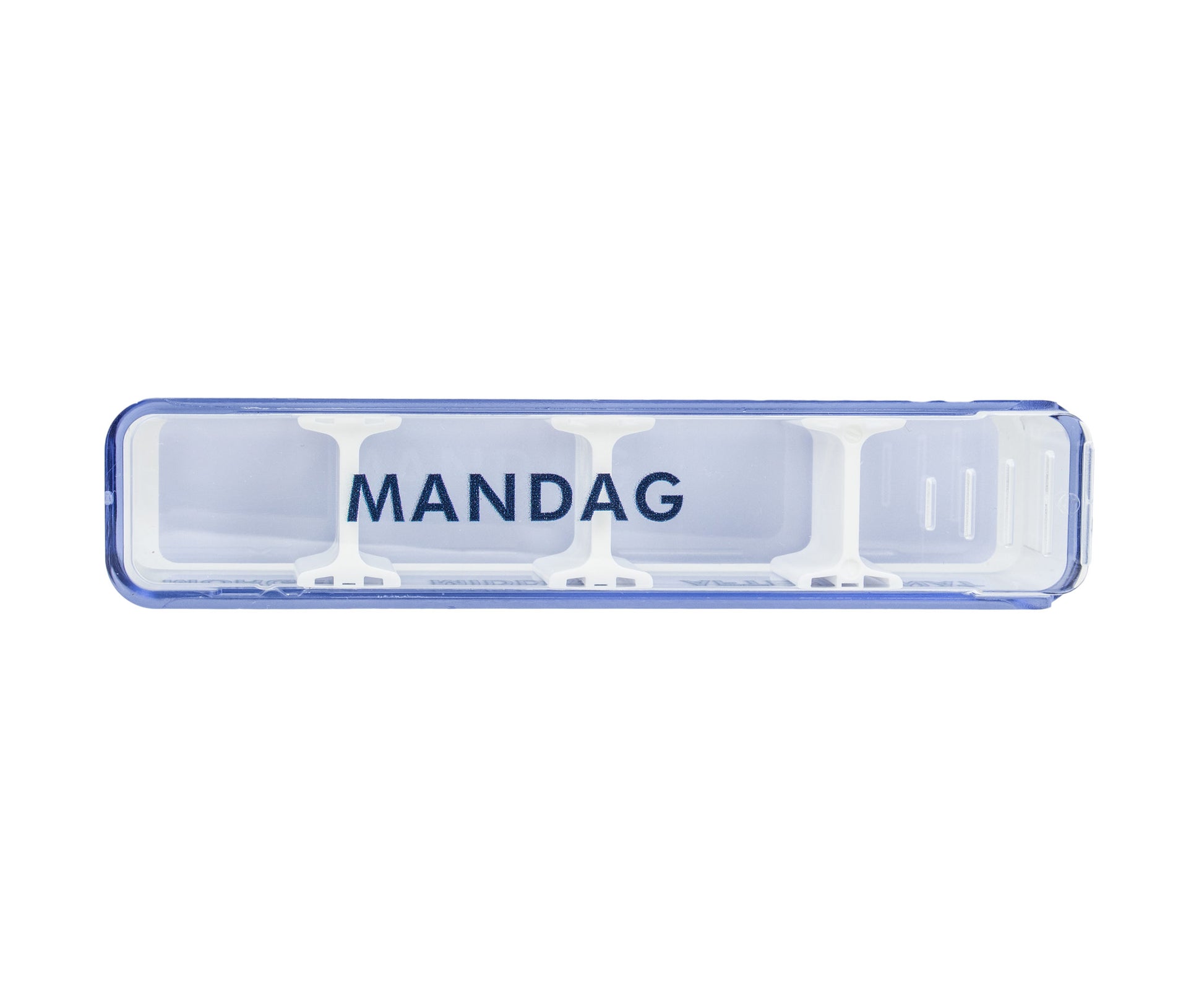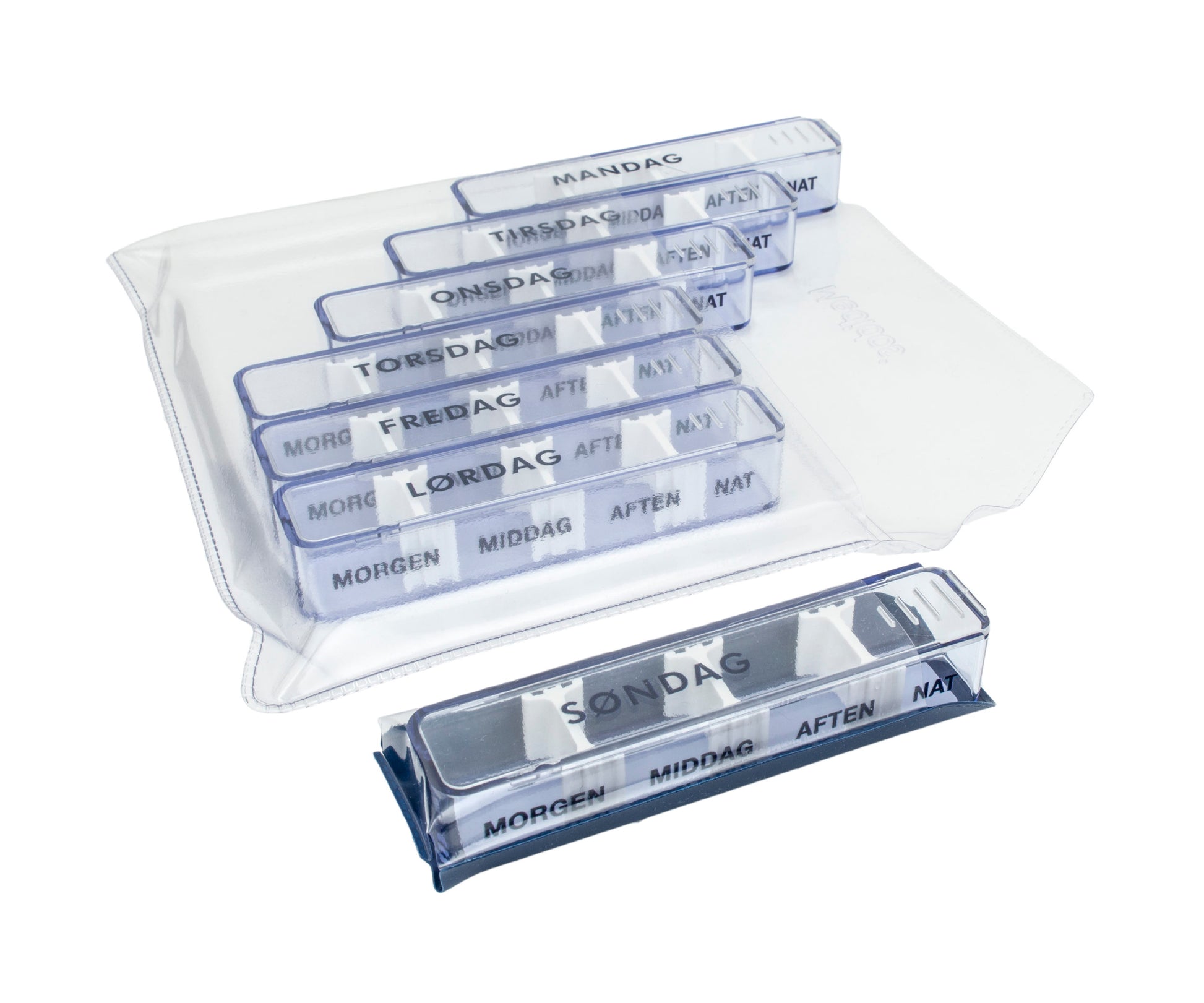 Hver doseringsæske har flytbare skillevægge, ugedage og med morgen, middag, aften og nat påskrevet på hver æske.