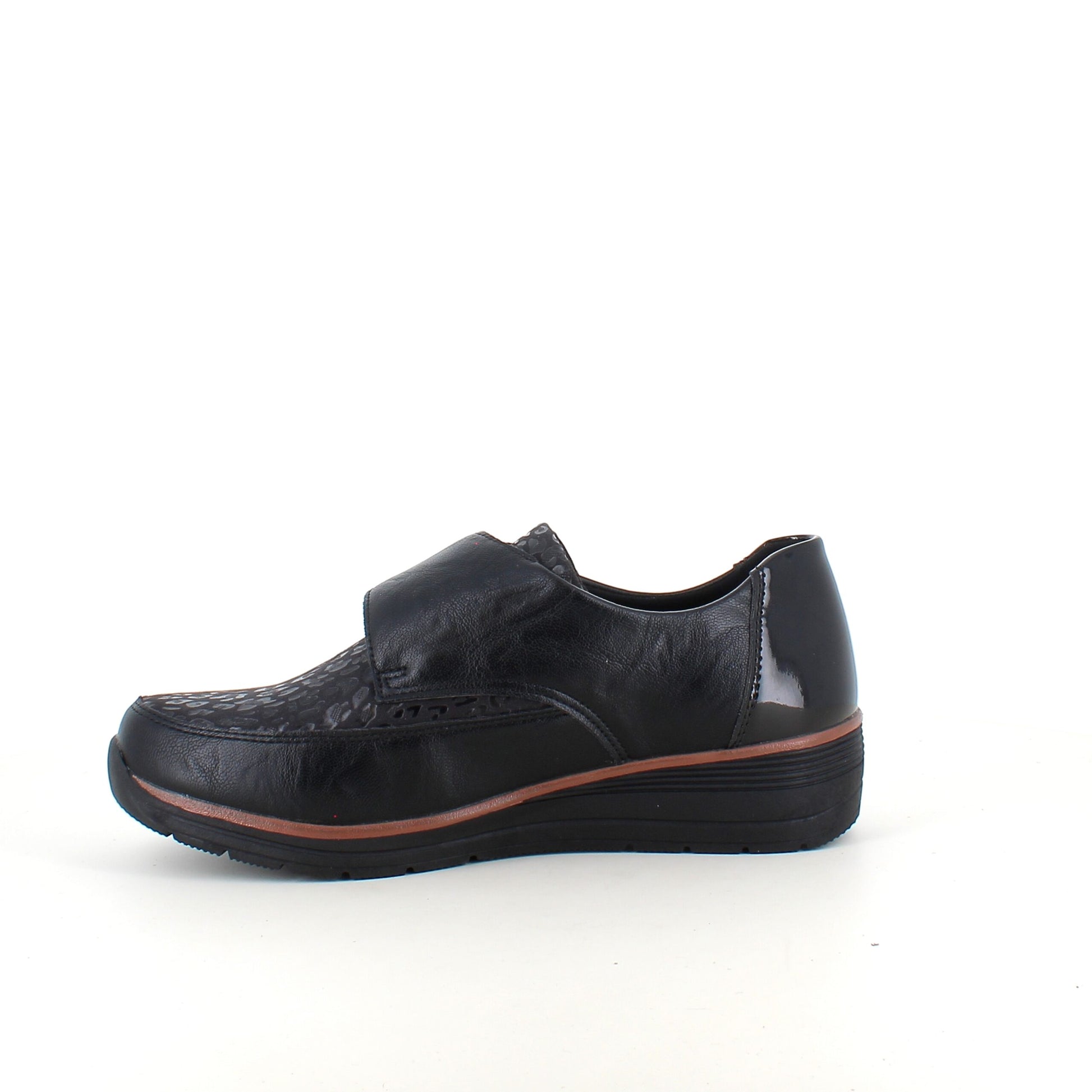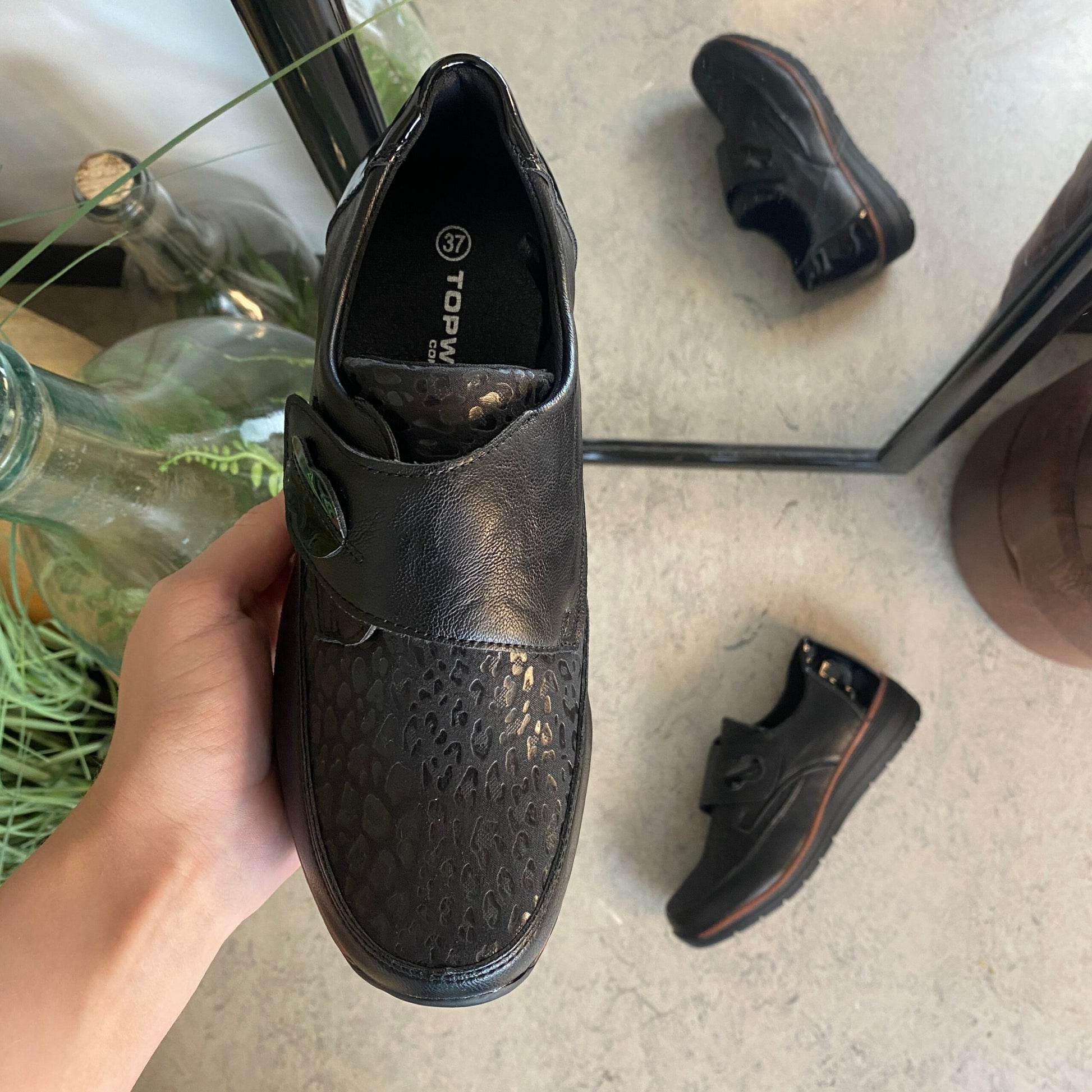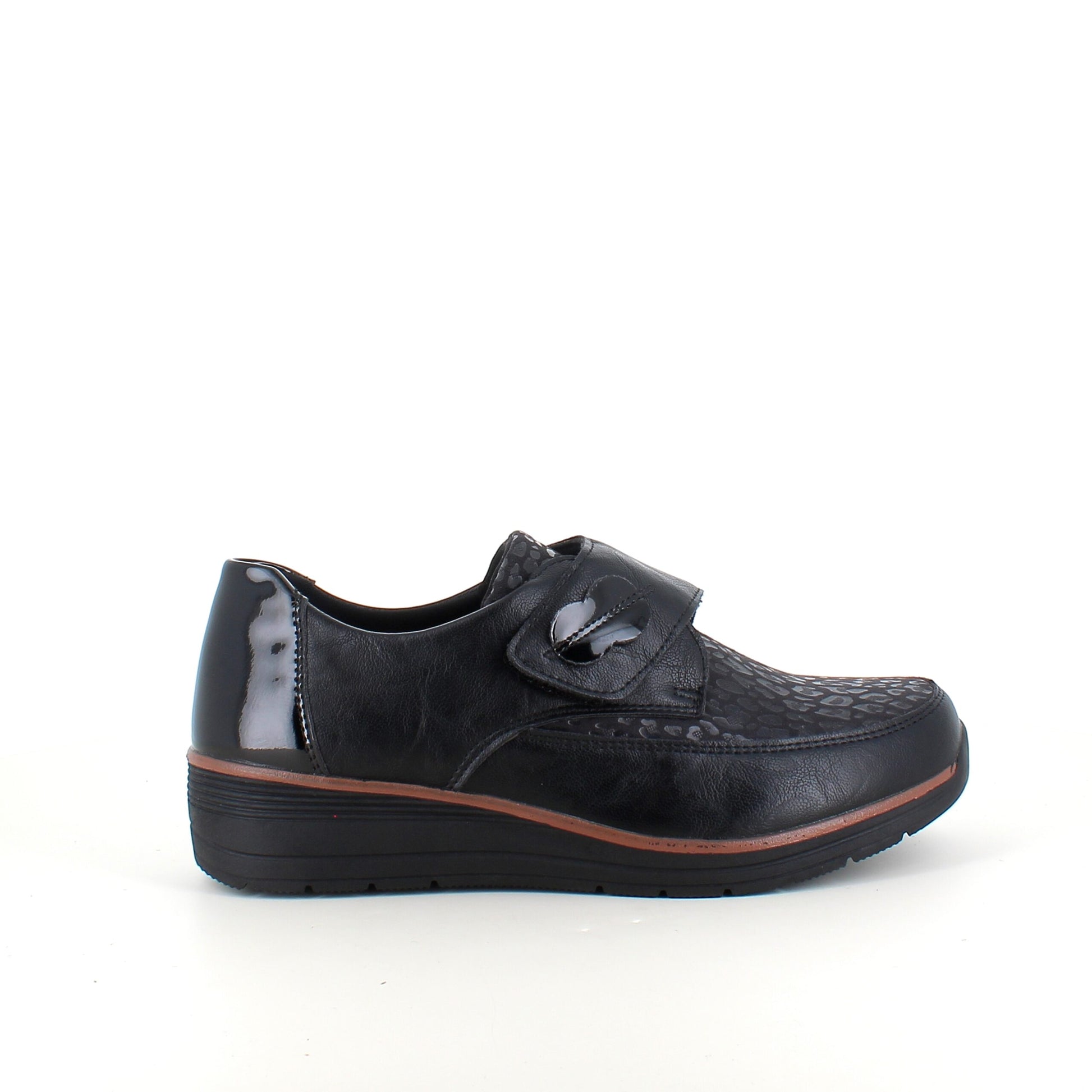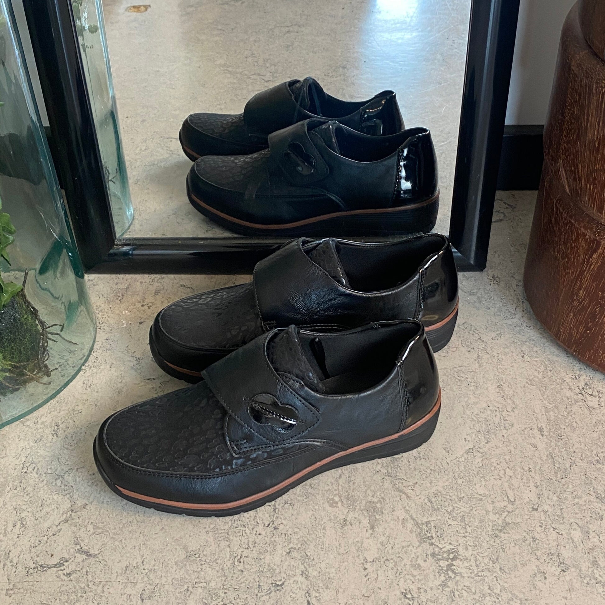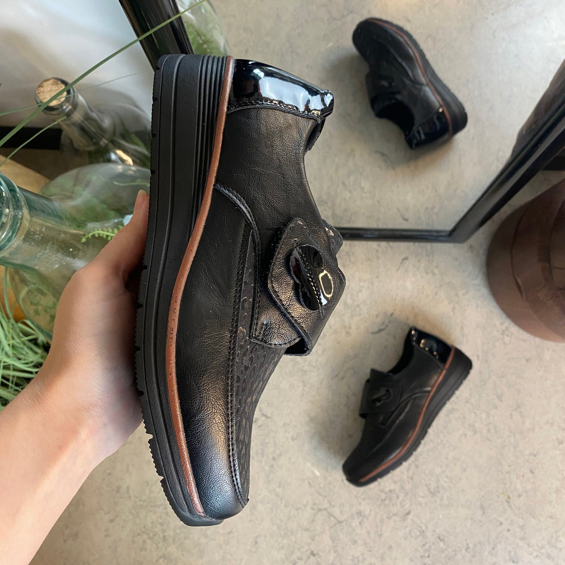 Skoen har velcrolukning som gør den nem at tage af og på.