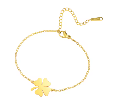Dette smukke firkløver armbånd er et feminint og tidløst smykke, designet i blankpoleret rustfrit stål med guldbelægning, der giver et eksklusivt og moderne look. Armbåndet har en fin, justerbar kæde og en firkløver charm, som symboliserer held, kærlighed og lykke – perfekt som gave til dig selv eller en, du holder af.