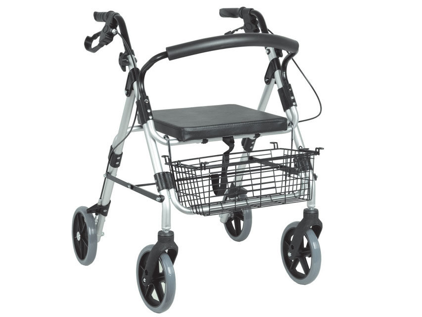 Rollatoren har et sæde og rygstøtte, en stor indkøbskurv foran og bremser på baghjul.