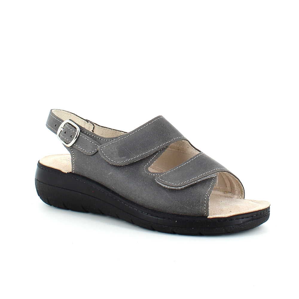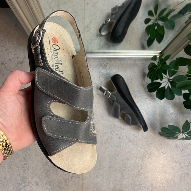 Bred ortopædisk sandal i grå med velcro i forfod og vrist.