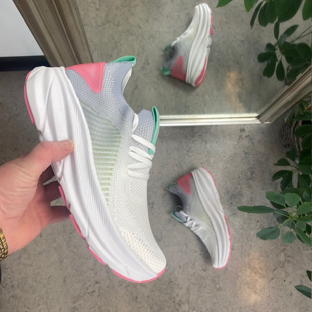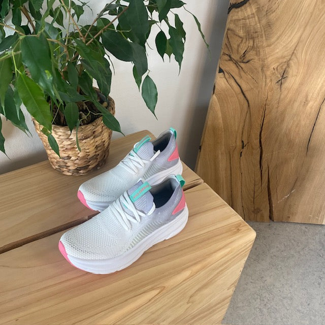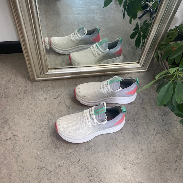 Grå/hvid sko med overdel i strikket mesh som sikre at dine fødder kan ånde. Skoen har elastisk slip on åbning og pynte snøre. Åbningen er ekstra foret, hvilket gør at skoen sidder godt fast om hælen. Indersålen er en blød skumsål. Mellemsålen har masser af stødabsorbering. Ydersålen har groft mønster som sikre et godt greb i underlaget. Skoen kommer i størrelse 36 - 41