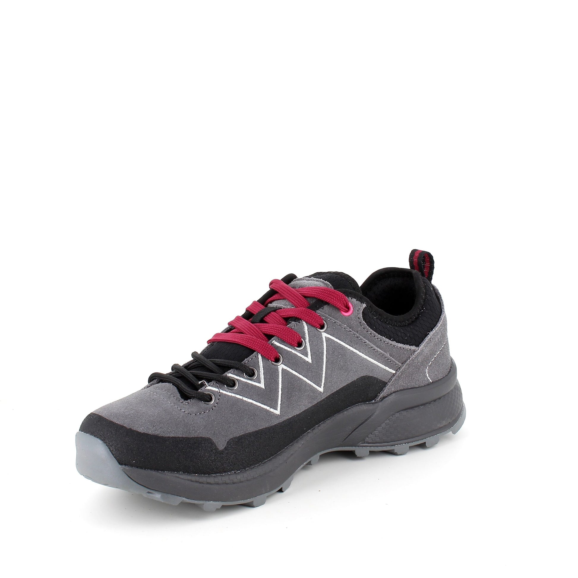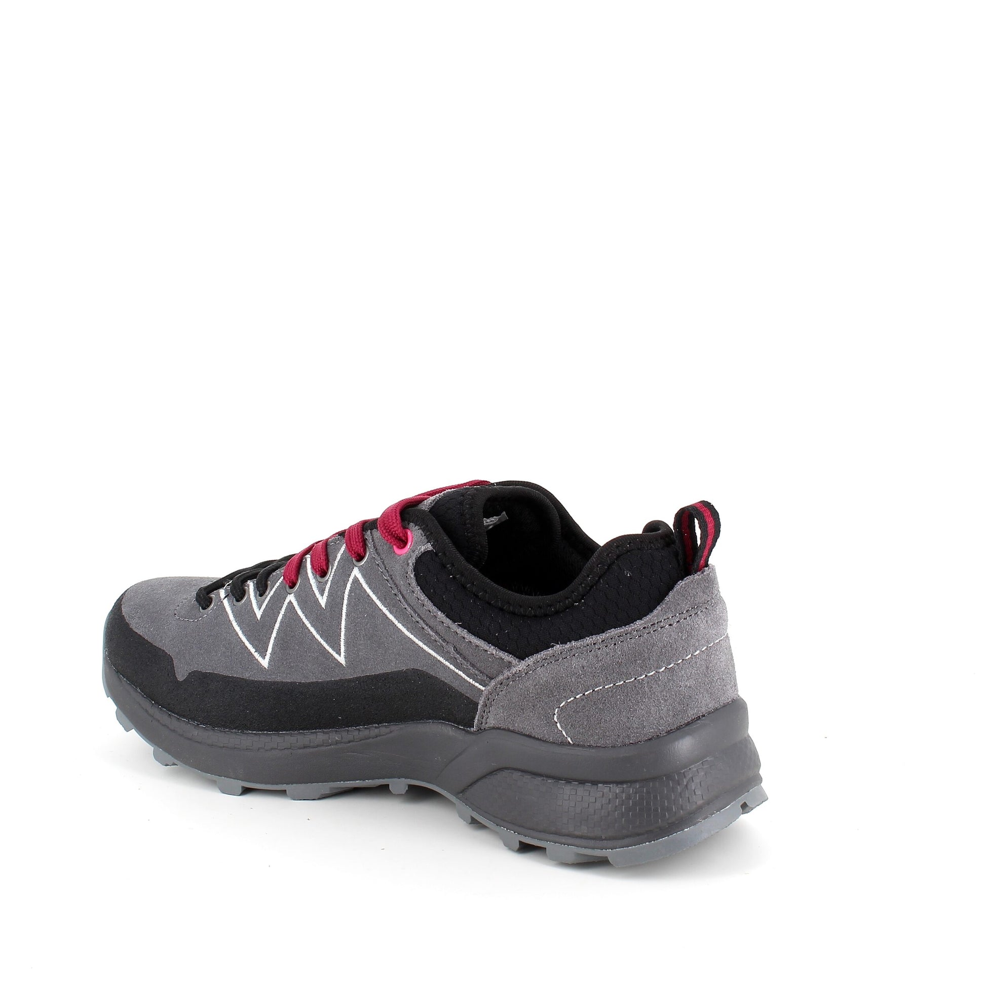 Vandreskoen er i grå med sorte og bordeaux detaljer