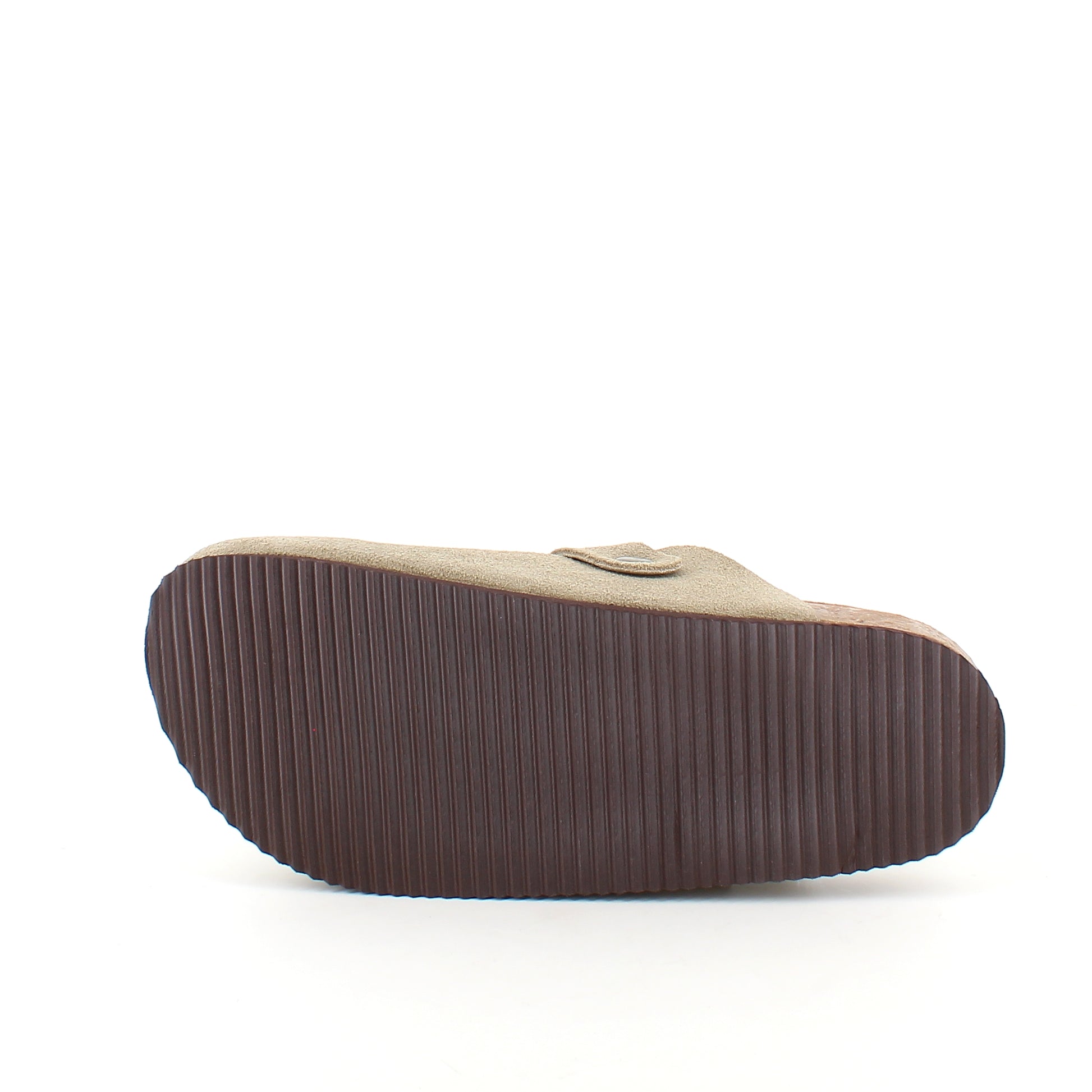 Sandalen har en overdel i gråbrun ruskind, pyntet med en justerbar rem.