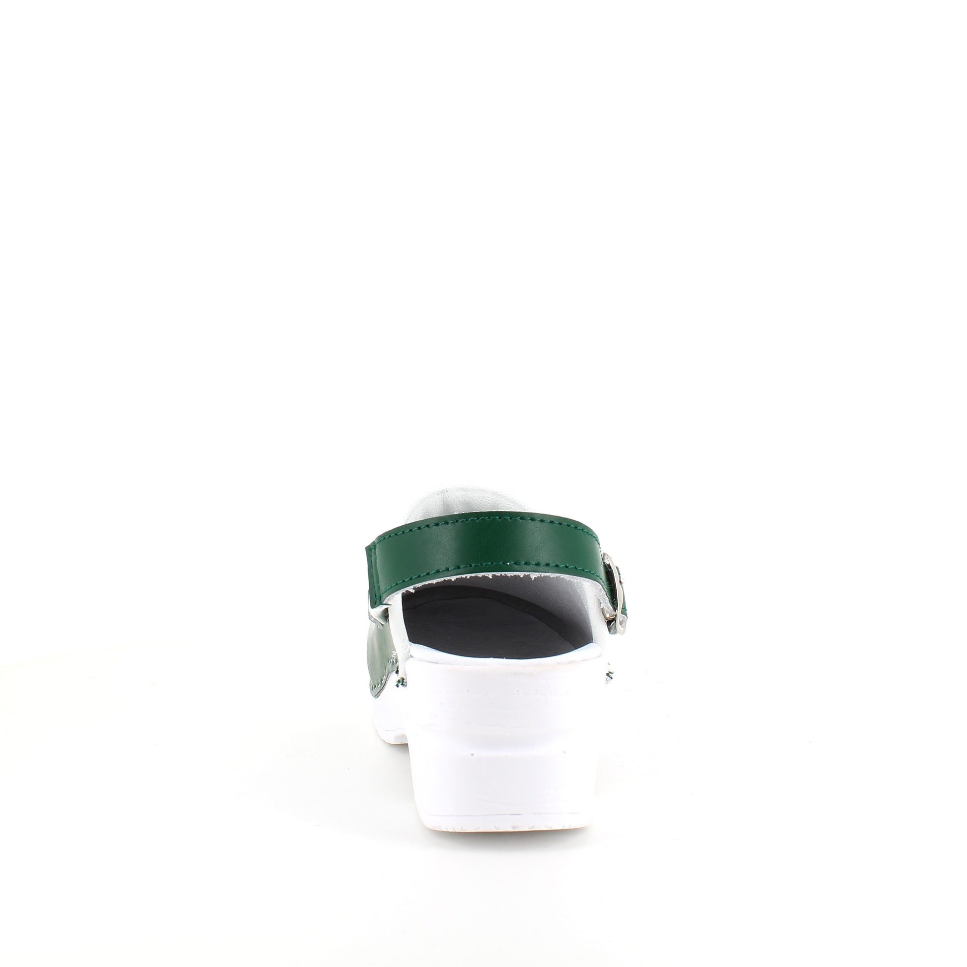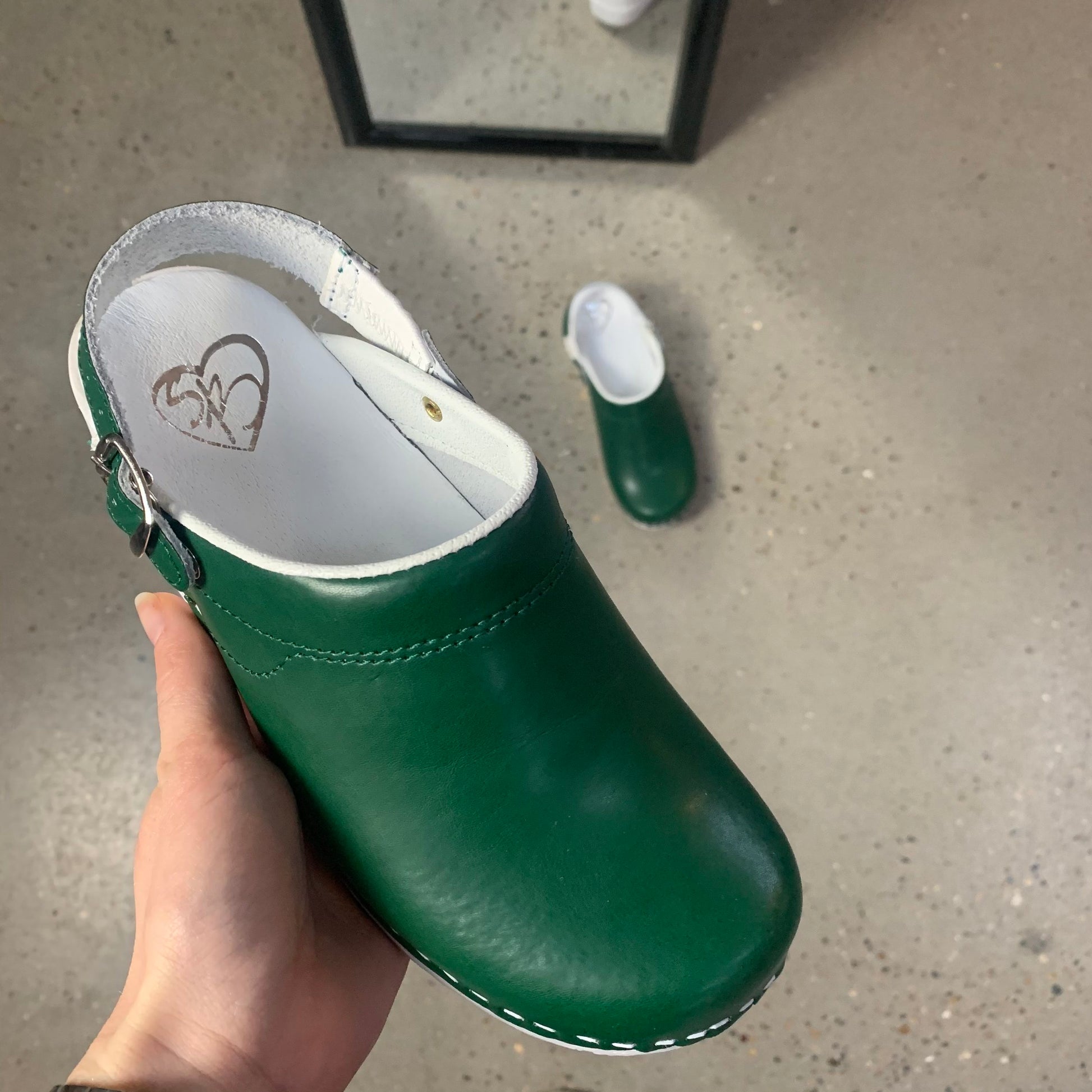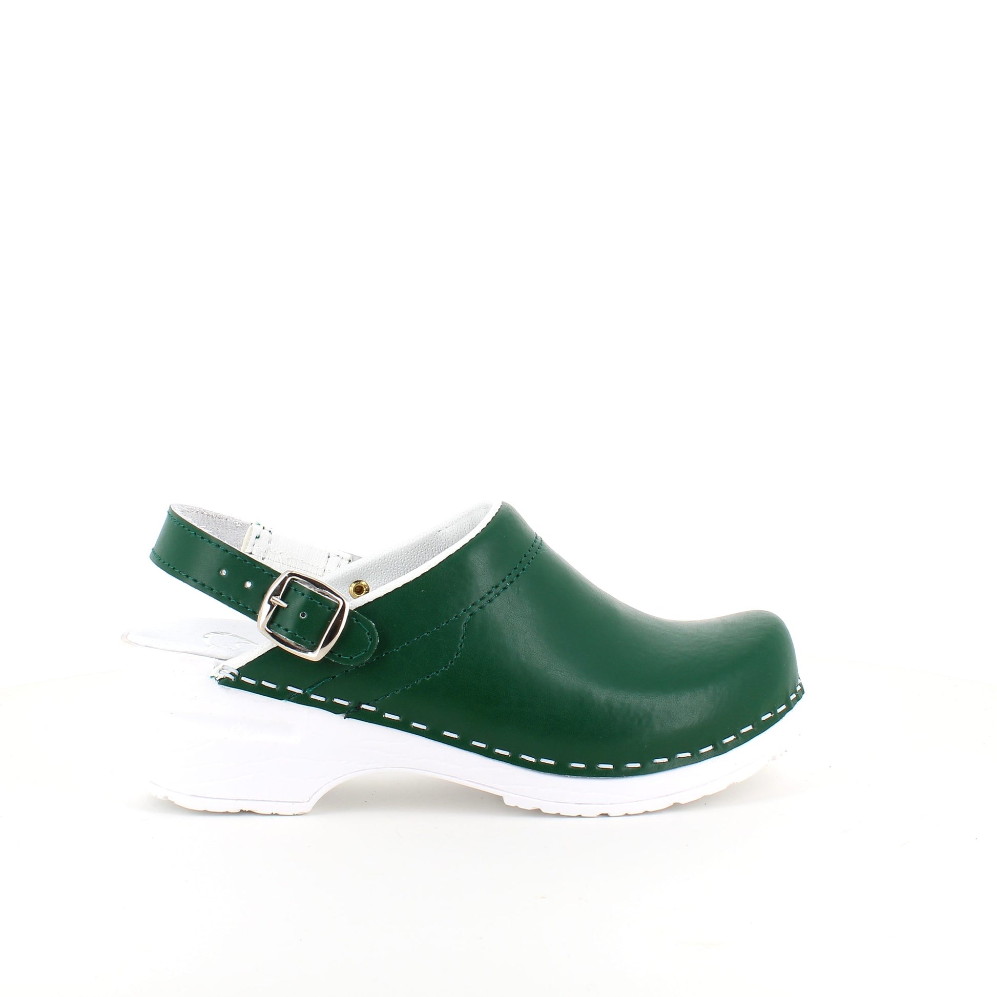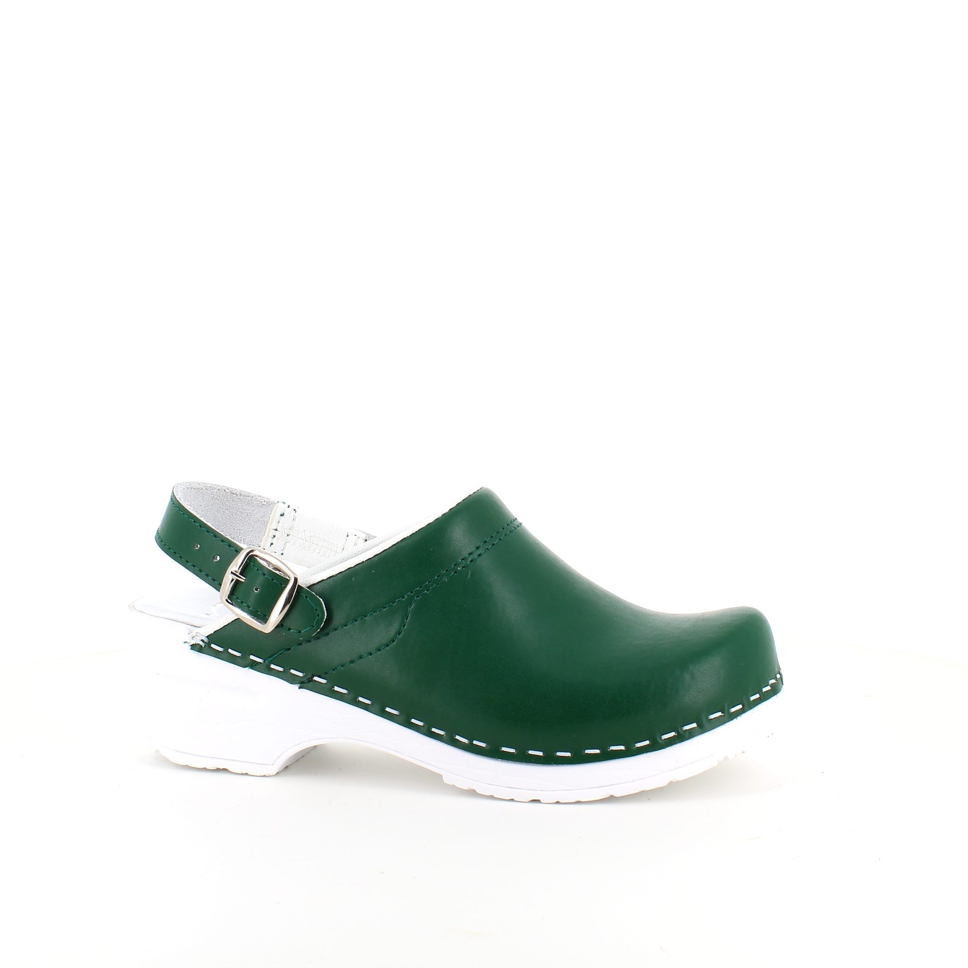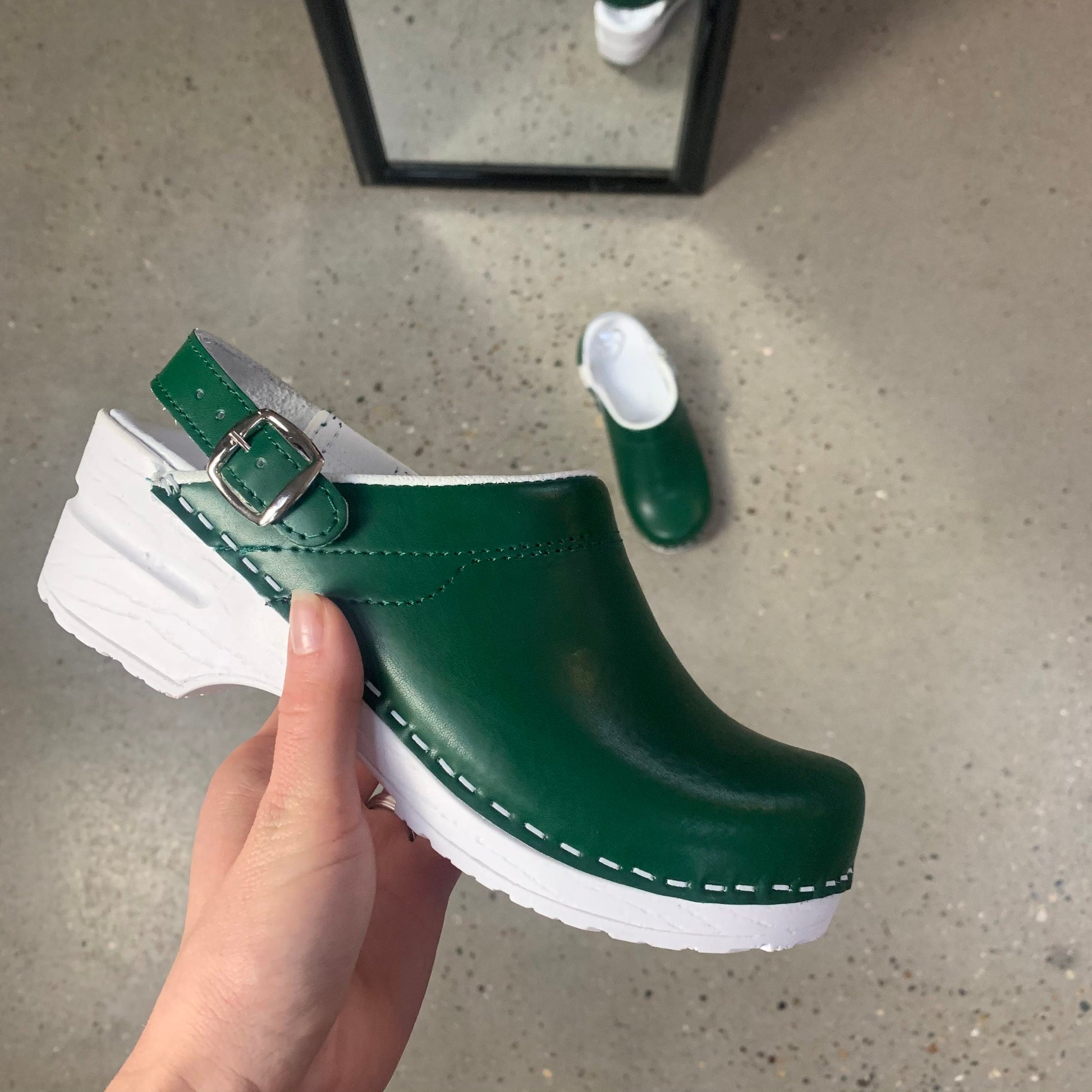 Skindtræsko i grøn med bagrem. Så den kan bruges med eller uden rem.