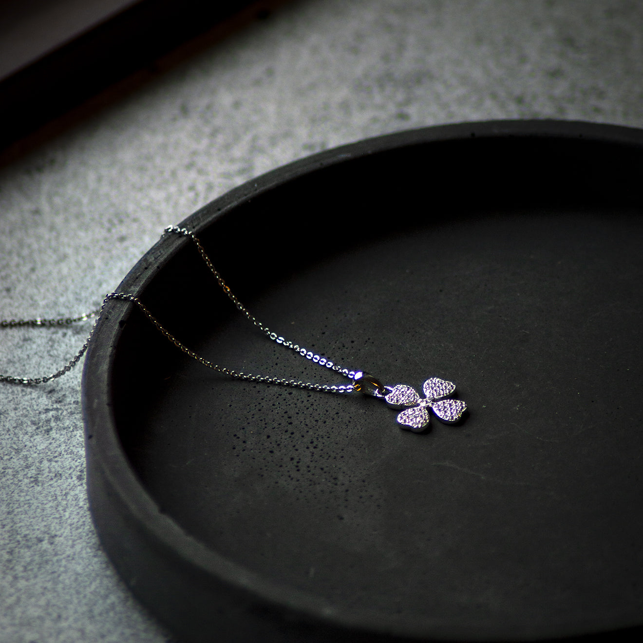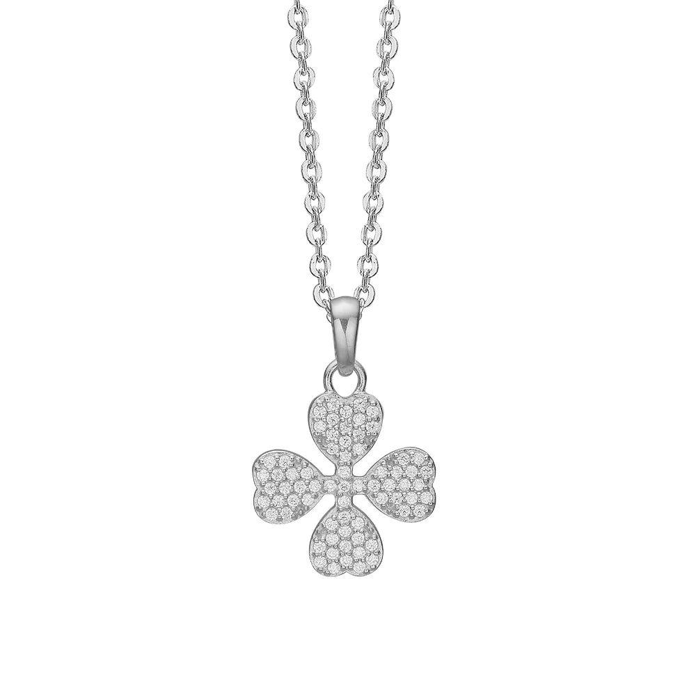 Et sølvfirkløver med skinnende zirconer, komplet med halskæde.