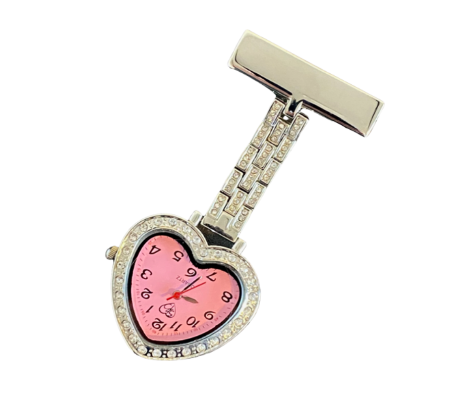 Hjerteformet lyserød urskive og krystaller. Tallene og viserne er i sølv - en unik detalje.