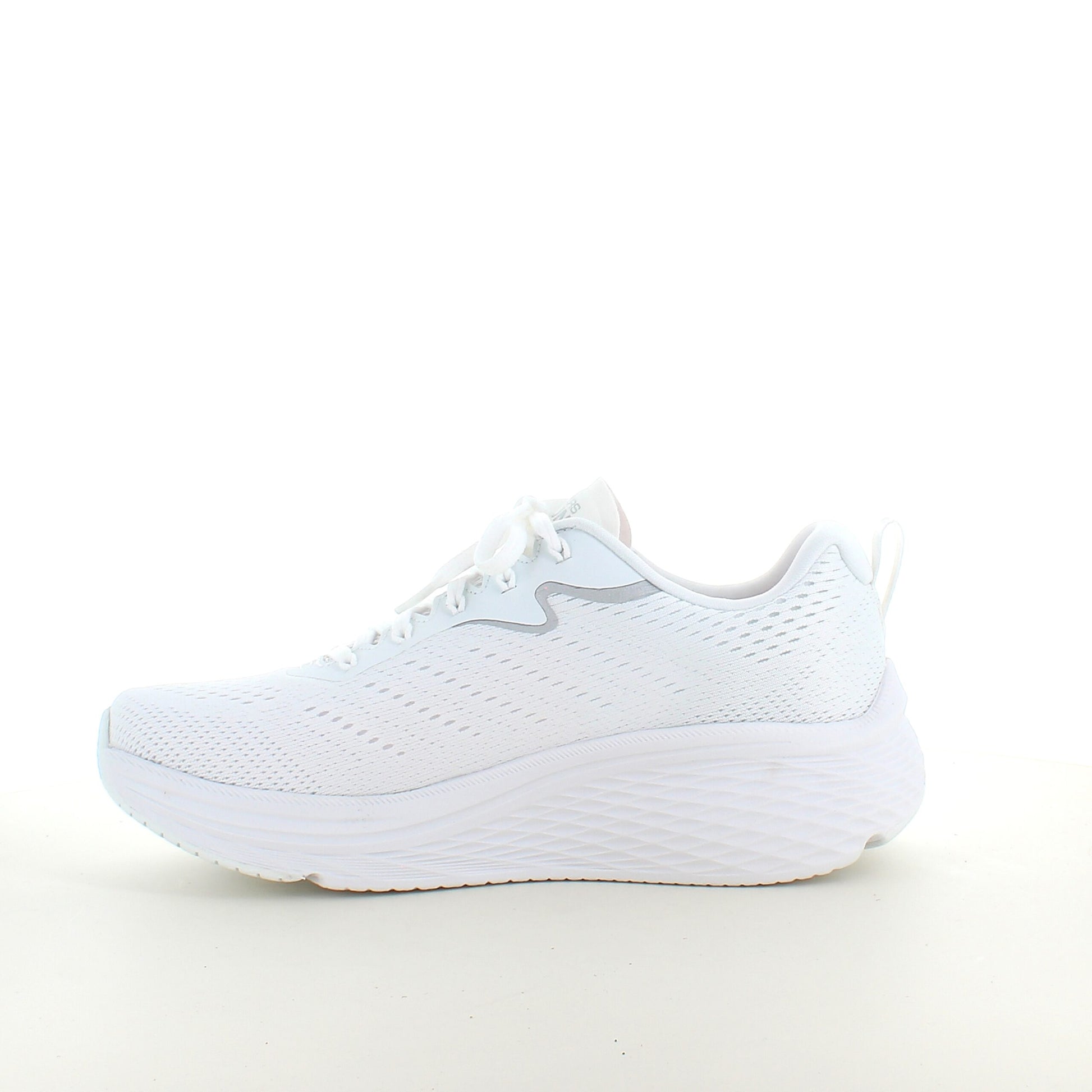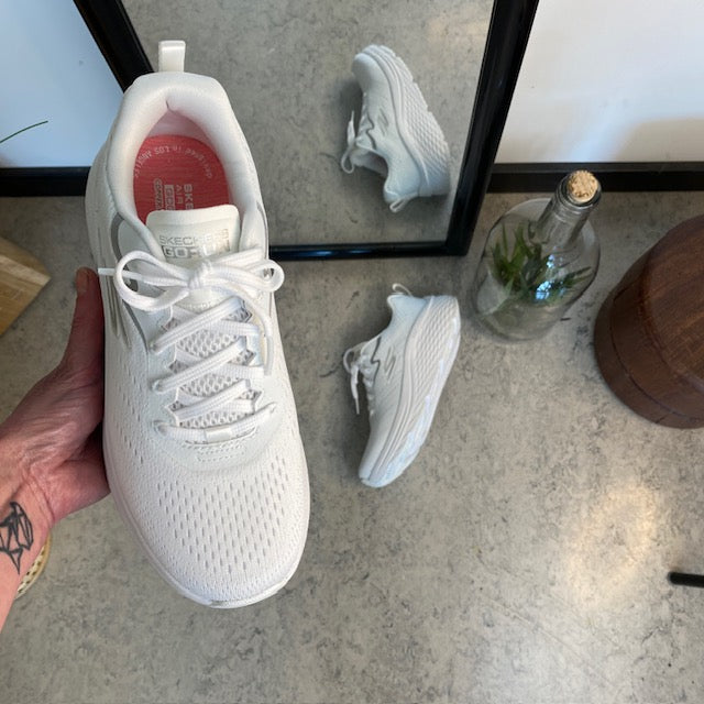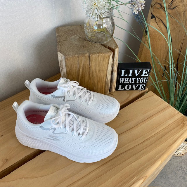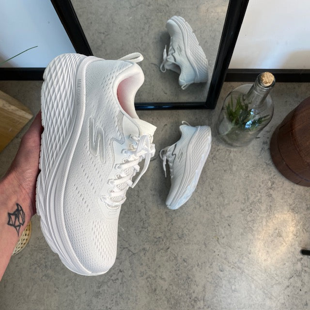 Hvid Skechers Max Cushion sko – optimal støtte og uovertruffen komfort.