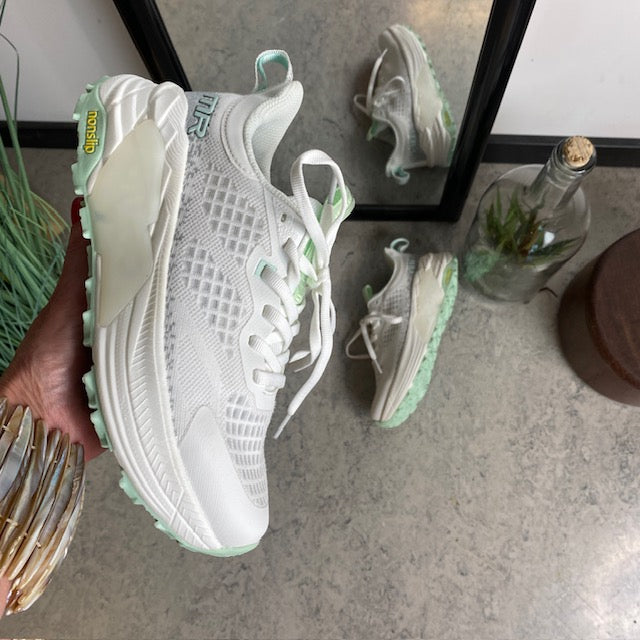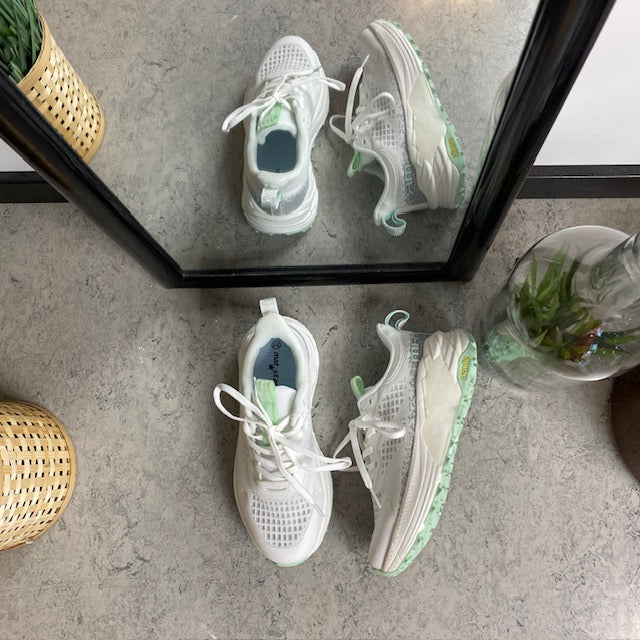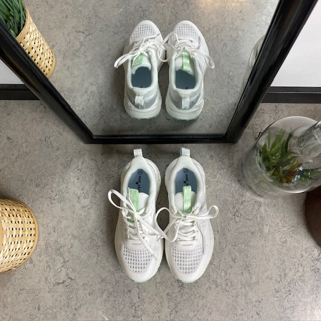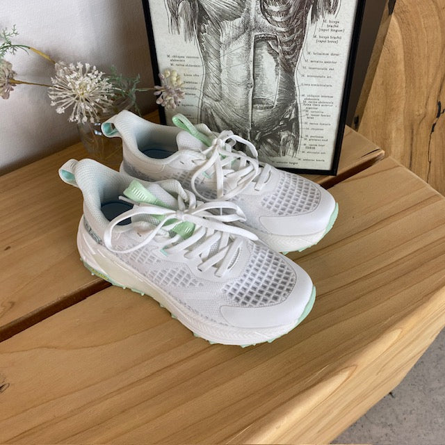 Denne hvide letvægtssko kombinerer et sporty look med praktiske funktioner.
