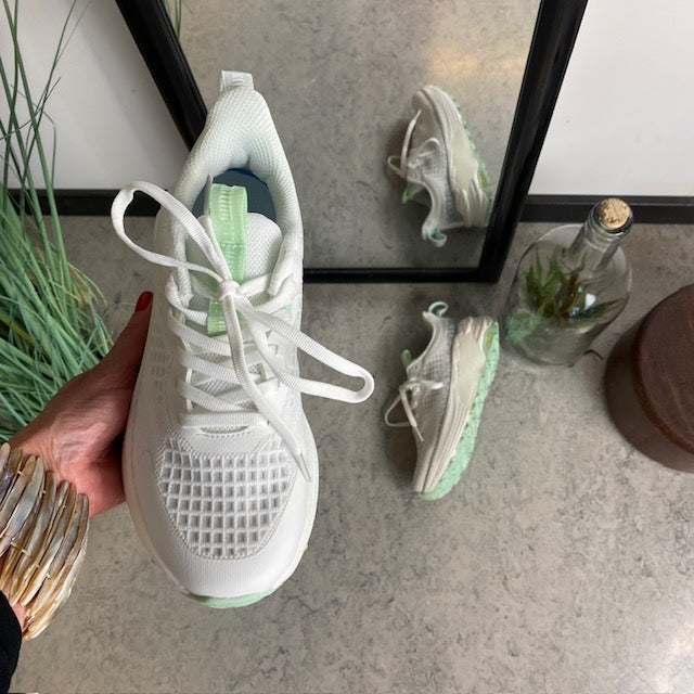 De flotte detaljer i en frisk farvekombination af hvid og turkis giver skoen et moderne og stilfuldt udtryk.