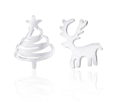 Søde øreringe i børstet sølvtone med et juletræ og et rensdyr.