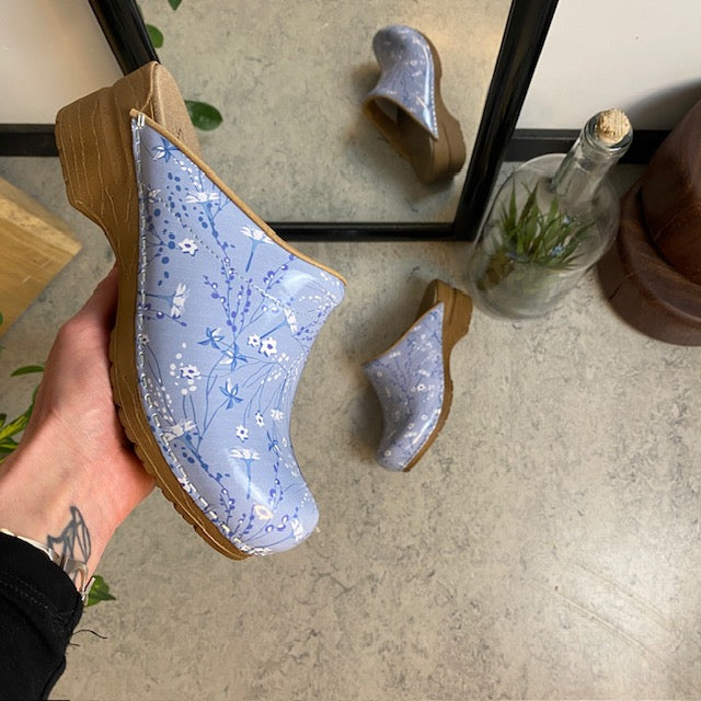 Lyseblå Sanita-træsko med smukt blomsterprint.