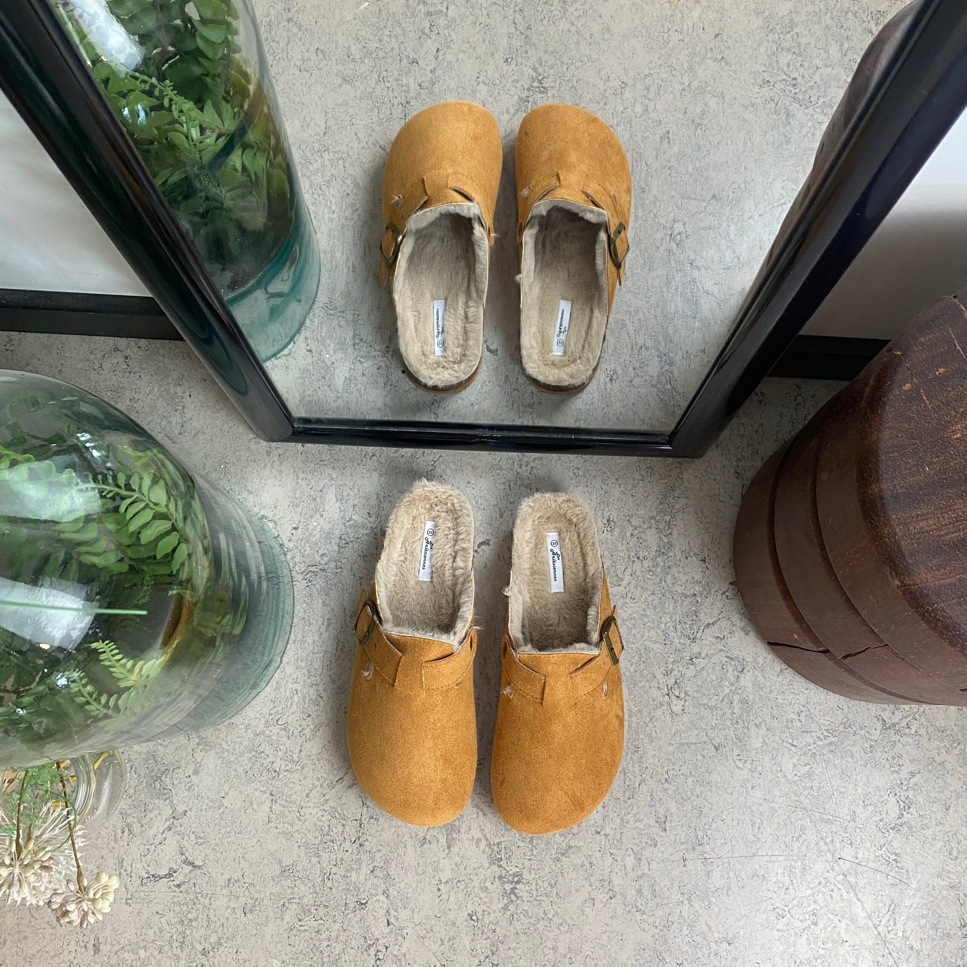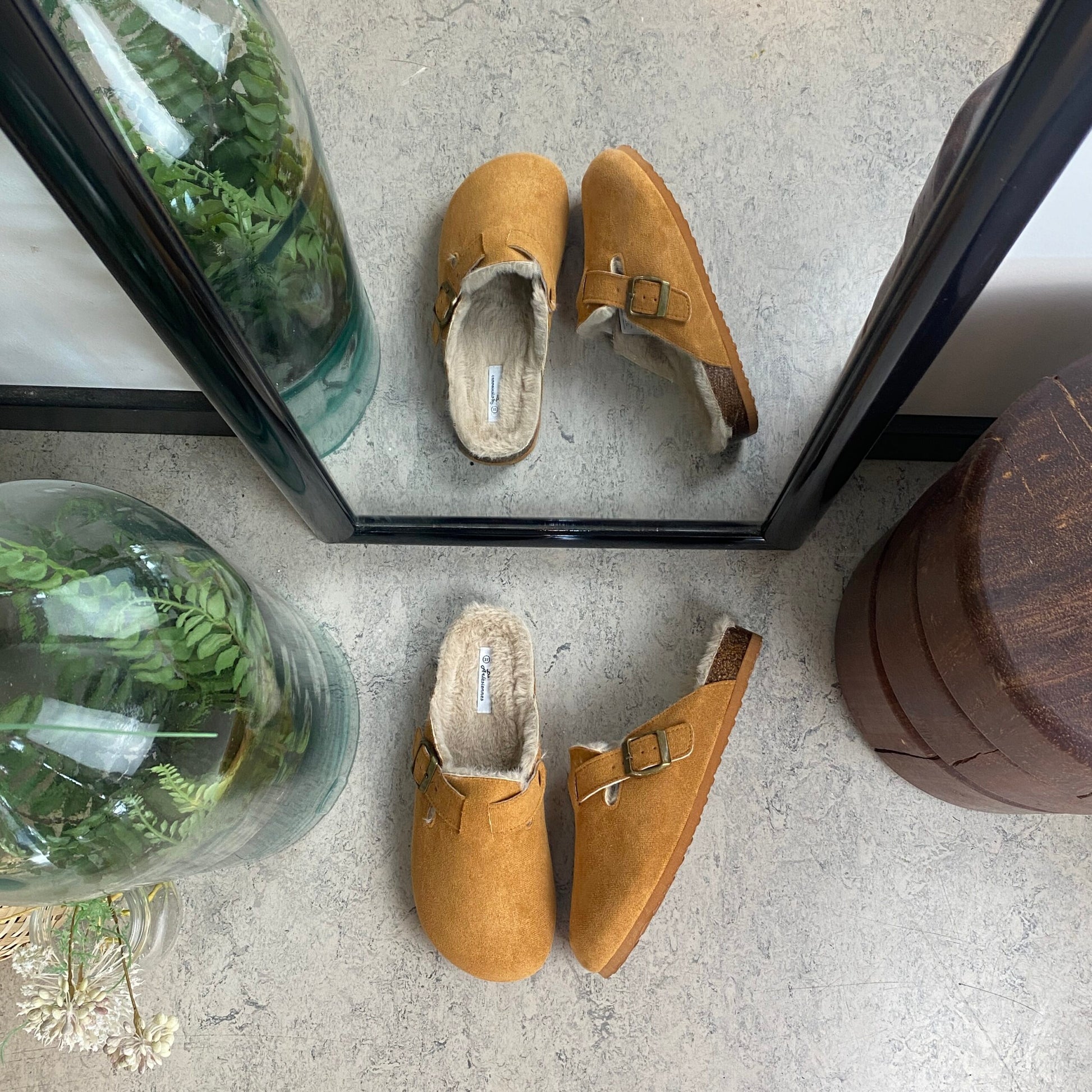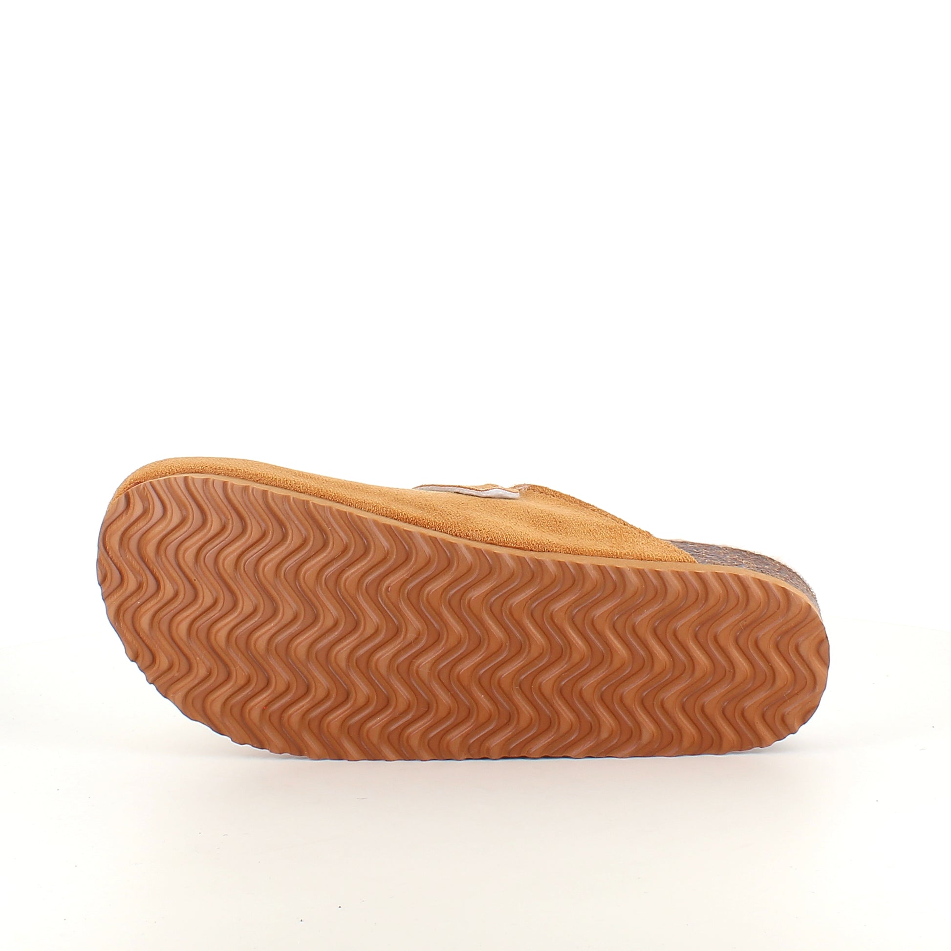 Lysebrun Slip-on hjemmesko med en overdel i tekstil. Hjemmeskoen har en justerbar rem over forfoden Skoen er foret med blødt fleece for Mellemsålen er en korksål og ydersålen er en blød, rillet sål. Sutskoen kommer i størrelserne 36-41