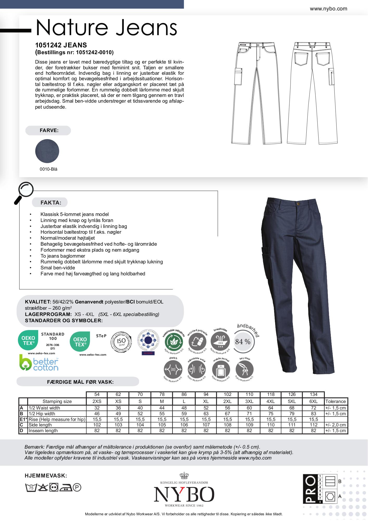 Nature Jeans-kollektionen er kendt for sin slidstærke metervare med stræk, som sikrer god pasform og ydeevne, hvilket giver en høj komfort i dagligdagen. Stoffet, som består af en blanding af genanvendt polyester, BC bomuld og EOL strækfiber, er specielt udviklet til at kunne tåle industriel vask uden at miste faconen eller komforten. Disse jeans har også en høj farveægthed i melange toner, der matcher alle overdele fra Nybo's Casual Health Care & Service kollektioner.