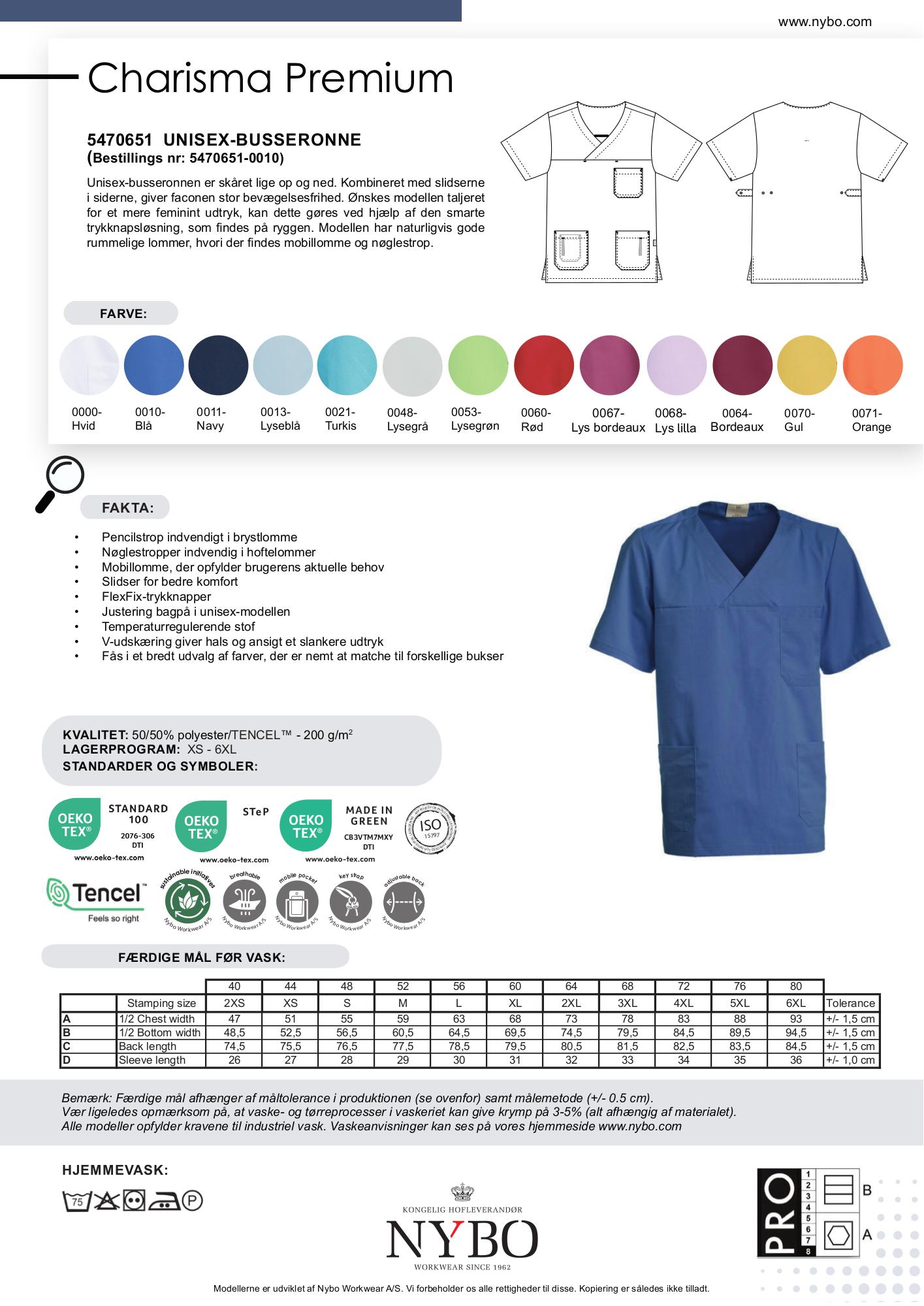 Den unisex busseronne fra Nybo Workwear A/S er det ideelle valg for dem, der søger både komfort og funktionalitet. Den er designet med en lige facon og praktiske slidser i siderne, hvilket sikrer en fremragende bevægelsesfrihed. Med det smarte trykknapsystem på ryggen kan modellen nemt taljeres for en mere feminin silhuet. Store, rummelige lommer med mobillomme og nøglestrop sørger for, at dine nødvendigheder altid er lige ved hånden. Busseronnen er lavet af temperaturregulerende TENCEL®, som ikke kun føles behagelig, men også reducerer svedlugt takket være stoffets bakteriemodstandsdygtige egenskaber. Som en ekstra bonus kan busseronnen specialbestilles med 10 cm ekstra længde.