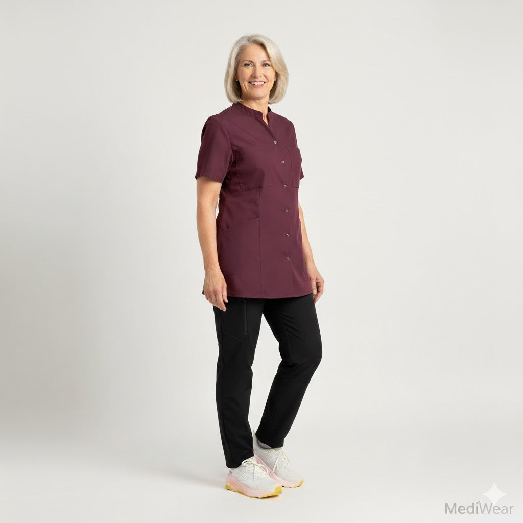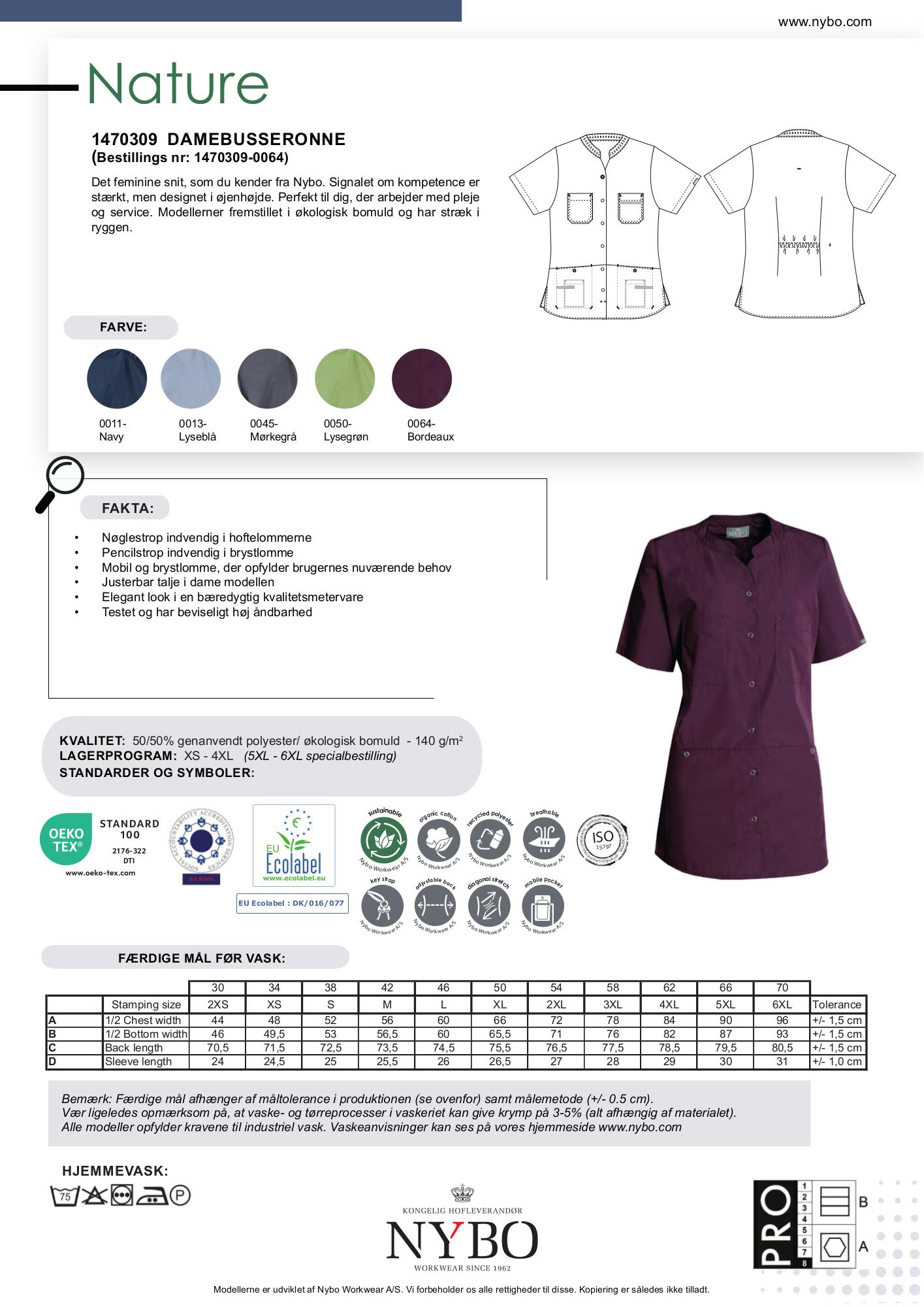 Nybo Workwear A/S præsenterer en elegant damebusseronne, der er designet til at kombinere stil og funktionalitet. Nybo Bordeaux er skabt med henblik på at levere høj komfort og et professionelt look, perfekt til pleje- og servicebranchen. Denne busseronne er lavet af økologisk bomuld og har indarbejdet stræk i ryggen for optimal bevægelsesfrihed. Stoffet består af 50% genanvendt polyester og 50% økologisk bomuld, hvilket gør den både bæredygtig og slidstærk. Det feminint skårne snit passer flot til jeans og gør det ideelt til daglig brug på jobbet.