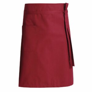 Nybo Workwear A/S præsenterer et alsidigt forklæde til både mænd og kvinder, ideelt til brug på caféer og restauranter. Dette bordeauxfarvede forklæde har et klassisk kort forstykke med et praktisk påsyet bindebånd og en lomme placeret strategisk på højre lår for nem adgang. Forklædet måler 60 cm i højden og 98 cm i bredden, hvilket gør det til en funktionel løsning i ethvert travlt arbejdsmiljø.