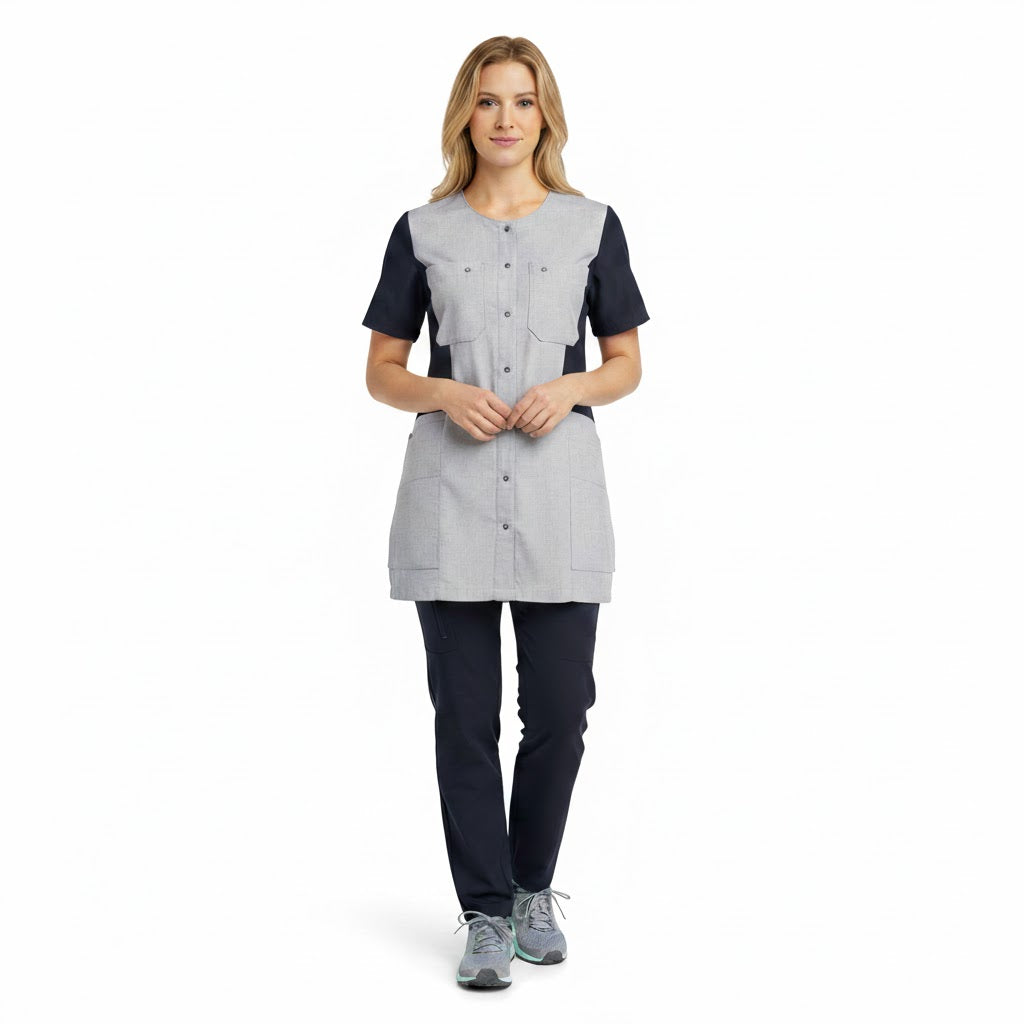 Oplev den ultimative komfort og funktionalitet med Nybo Grå Melange Dametunika Sporty Mix. Denne let taljerede dametunika byder på en skjult trykknapslukning og blød rib i halsåbningen for ekstra komfort. De konstruerede stræk både foran og på ryggen sikrer stabilitet og bevægelsesfrihed, mens en indvendig taljejustering giver mulighed for en individuel pasform. Praktiske detaljer omfatter to store brystlommer med en skjult pen-strop og en strop til ID-kort, plus rummelige hoftelommer, der kan lukkes, med nøglestropper og ekstrastore lommer til mobiltelefon.
