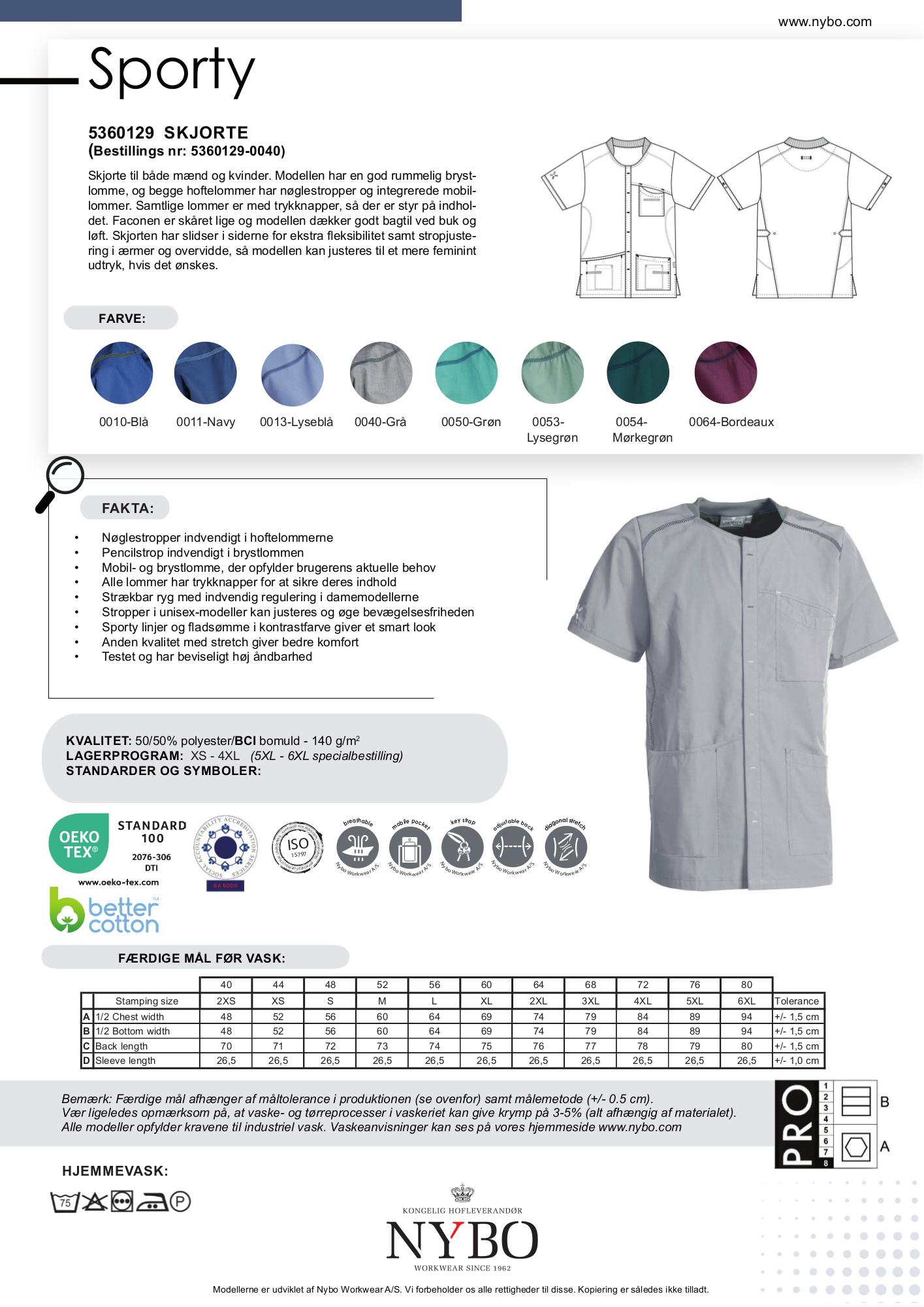 Sporty-kollektionen er inspireret af tidens løbetøj og kombinerer rummelighed og pasform med dynamiske snit og linjer i kontrastfarver, hvilket giver et frisk og sporty udtryk. Udover den klassiske grå farve tilbydes tunikaen også i blå, navy, lyseblå, lysegrøn, mørkegrøn og bordeaux. Materialet er en blanding af 50% polyester og 50% BC-bomuld, hvilket sikrer både holdbarhed og komfort.