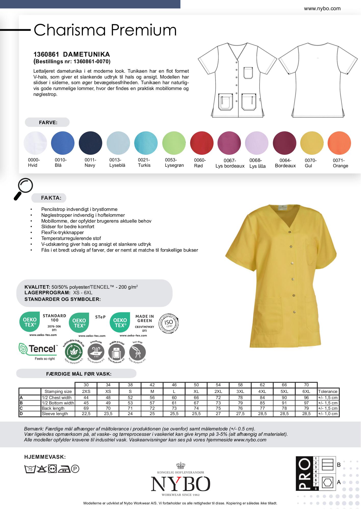 Kollektionen,'Charisma Premium', tilbyder en frisk og munter vinkel på arbejdstøj med en række mættede pastelfarver som hvid, blå, navy, lyseblå, turkis, lysegrøn, rød, bordeaux, lys bordeaux, lys lilla og orange. Det minimalistiske nordiske design kombineret med det bløde og slidstærke stof gør denne tunika til et perfekt valg inden for sundheds- og plejeområdet samt servicesektoren. Farvestærkt og praktisk design, der både forbedrer komfort og reducerer svedlugt takket være den bakterieresistente TENCEL®-kvalitet.