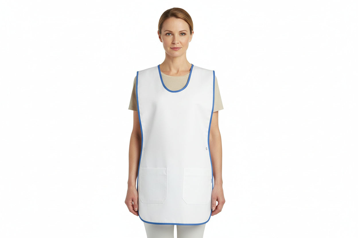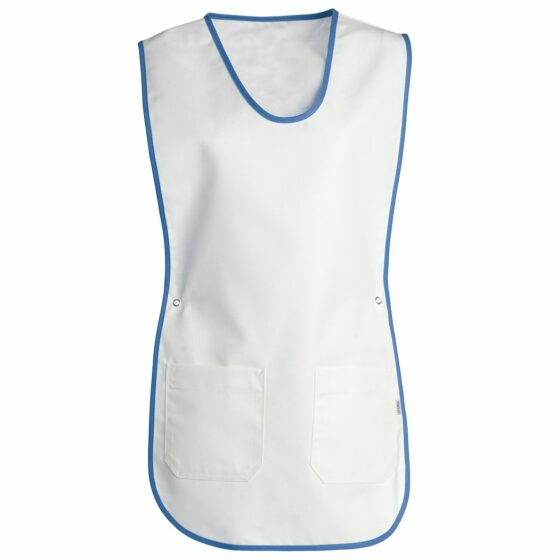 Nybo Workwear A/S introducerer et justerbart sandwichforklæde i en elegant hvid med blå kant, designet til både mænd og kvinder. Dette alsidige forklæde er udstyret med to praktiske lommer foran, så du nemt kan opbevare værktøj eller andre nødvendigheder. Den farvede kant gør det let at identificere størrelsen, hvilket forbedrer logistikken og organiseringen. Small er markeret med en gul kant, large med en grøn kant, og 2XL med en blå kant. Dette forklæde er specielt designet til at passe perfekt takket være de justerbare stropper i siderne, som sikrer en behagelig og tilpasset pasform til alle brugere.