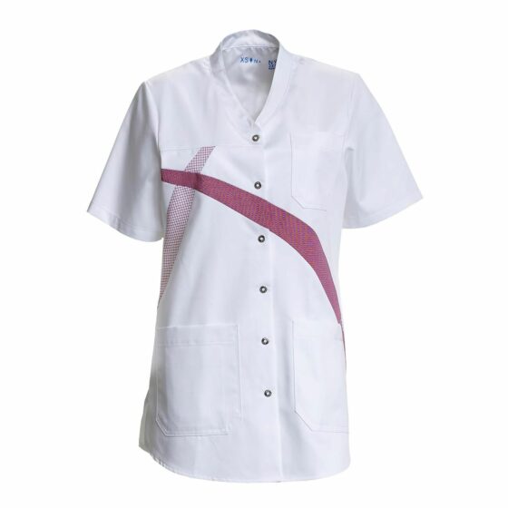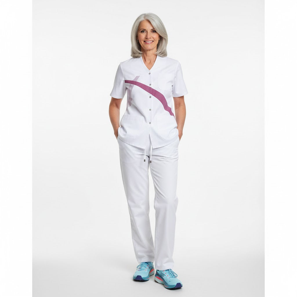 Damenes valgsæt til sundhedssektoren bygger på Comfortec Satin, som sikrer maksimal komfort med en høj andel bomuld indvendigt. Overdelene fås i en elegant hvid med bordeauxfarvede striber og tern, som kan matches med firmaets logo, hvilket gør serien ideel til CI-beklædning.