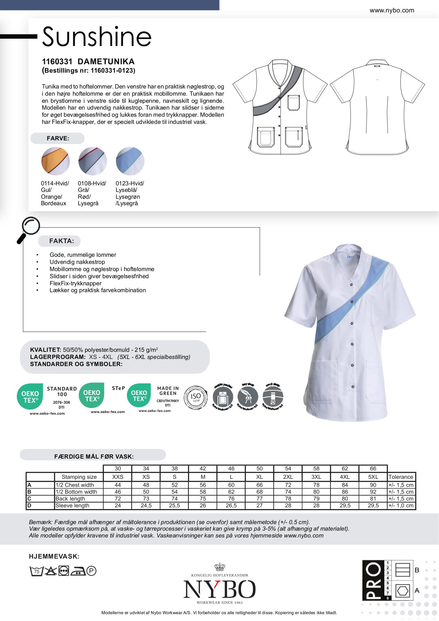 Mærket Nybo Workwear A/S præsenterer med stolthed en komfortabel og funktionel dametunika i hvid og lyseblå. Denne tunika er skabt med praktiske detaljer såsom to rummelige hoftelommer; den venstre er udstyret med en praktisk nøglestrop, mens den højre har en smart dobbeltlomme. Brystlommen på venstre side giver plads til kuglepenne, navneskilte og lignende, og en udvendig nakkestrop gør tunikaen endnu mere praktisk. For optimal bevægelsesfrihed har designet slidser i siderne, og det lukkes nemt med trykknapper, der inkluderer flex fix-knapper specielt udviklet til industriel vask.