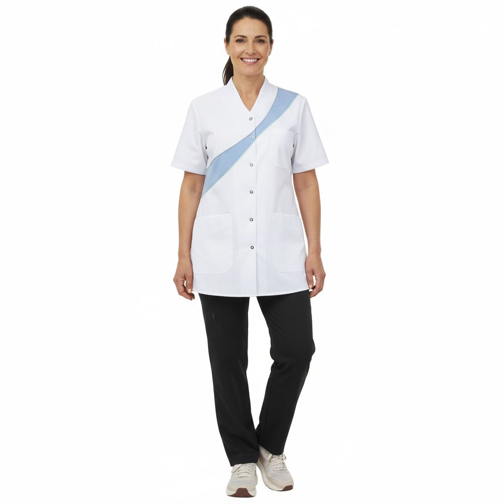Denne klassiker fra serien er skræddersyet til sundhedssektoren og fremstillet af Comfortec Satin, som sikrer maksimal komfort med en høj bomuldsandel mod kroppen. Kollektionen er perfekt til CI-beklædning, hvor besætningsfarverne kan tilpasses virksomhedens logo. Ud over farven hvid og lyseblå, fås tunikaen også i hvid og grå samt hvid og gul.