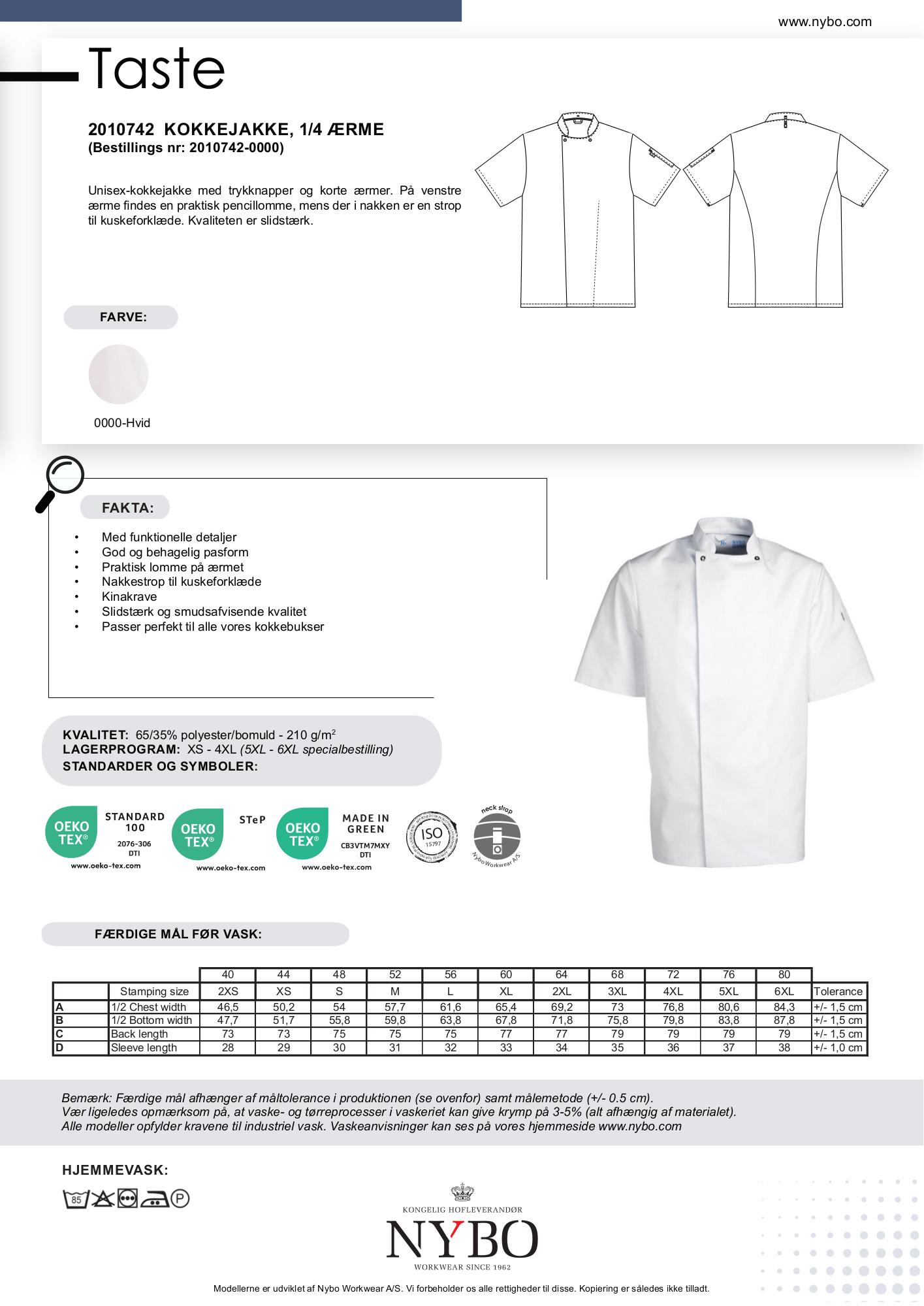 Nybo Workwear A/S introducerer den hvide unisex Taste kokkejakke med korte ærmer, ideel til professionelle kokke. Denne kokkejakke har funktionelle trykknapper og en nyttig pencillomme på venstre ærme samt en praktisk strop i nakken til kuskeforklæde. Fremstillet i et slidstærkt og smudsafvisende materiale, der består af 65% polyester og 35% bomuld. Kvaliteten på 210 g/m² sikrer en jakke, der tåler daglig brug i køkkenet.