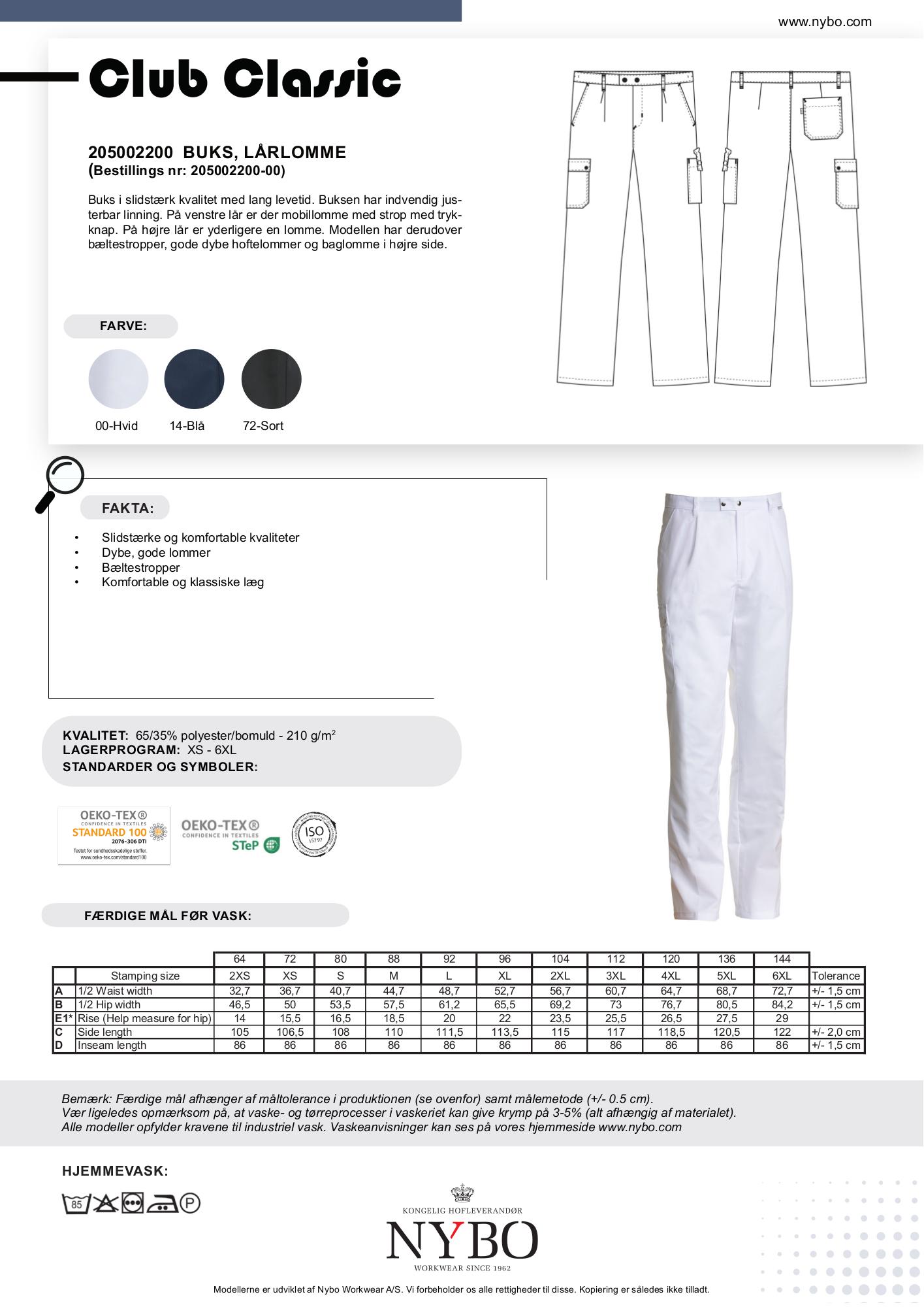 Nybo Workwear A/S præsenterer de slidstærke og alsidige hvide herrebukser fra Club-Classic kollektionen. Disse bukser skiller sig ud med deres imponerende holdbarhed og justerbare linning for optimal komfort. Designet inkluderer flere praktiske lommer, herunder en mobillomme med strop og trykknap på venstre lår, en ekstra lomme på højre lår samt gode dybe hoftelommer og en baglomme i højre side. Med bæltestropper og en robust konstruktion i 65% polyester og 35% bomuld, er disse bukser ideelle til både arbejdsbrug og hverdagsaktiviteter. Club-Classic kollektionen byder på en klassisk og funktionel serie af bukser, der imødekommer mange forskellige behov. Uanset om du vælger den tidløse hvide farve, vil du opleve kvalitet og stil i en enkel pakke. Tilgængelige størrelser: XS, S, M, L, XL, 2XL, 3XL, 4XL, 5XL, 6XL. Merpris 15% for overstørrelser 2XL og op.