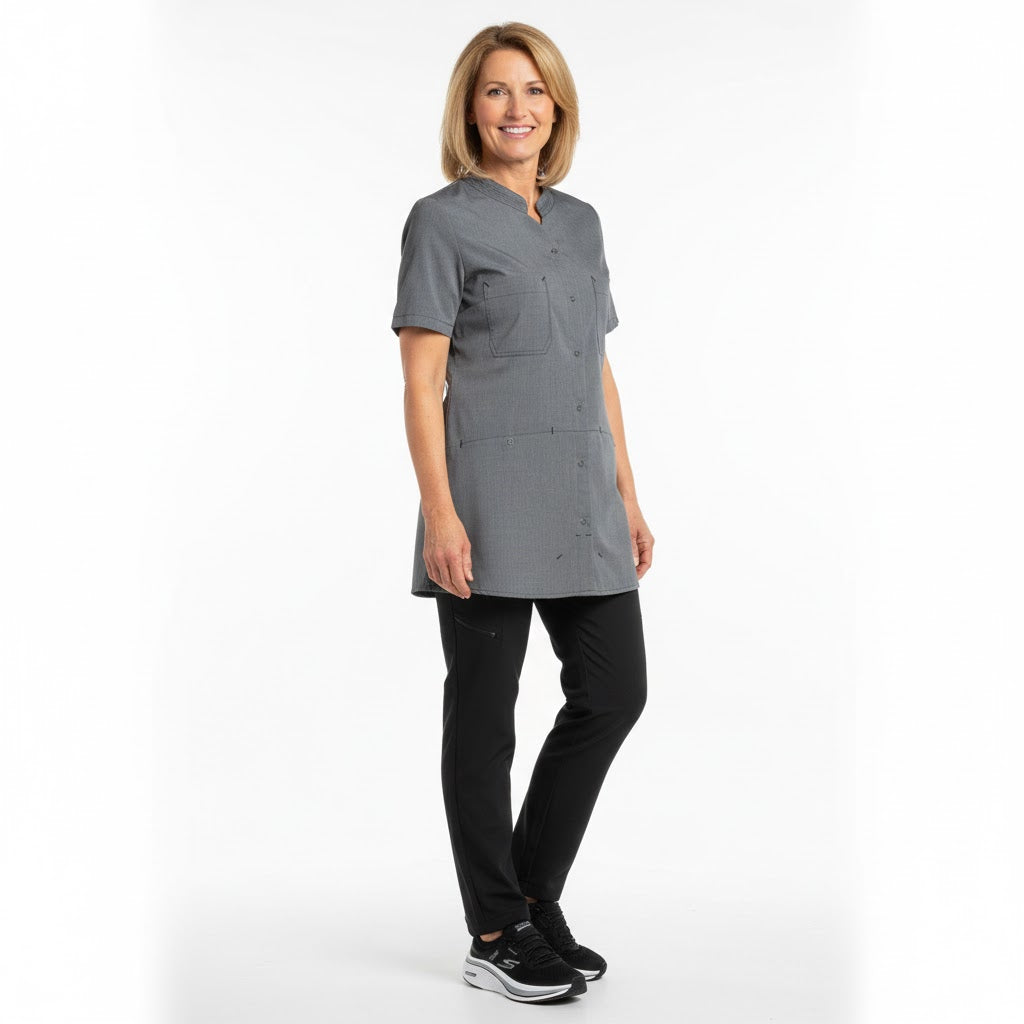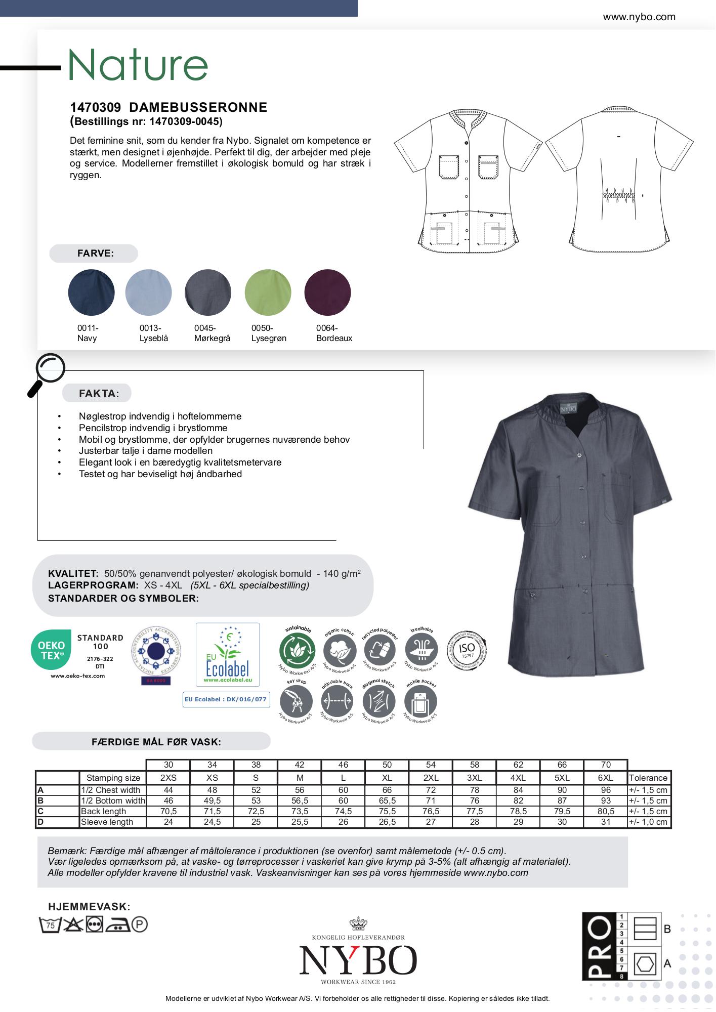 Nybo Koksgrå Damebusseronne fra Nybo Workwear A/S er den perfekte beklædningsgenstand til den professionelle kvinde inden for pleje og service. Damebusseronnen udmærker sig ved sit feminine snit, der kombinerer kompetence med et imødekommende design. Denne busseronne er fremstillet af økologisk bomuld og har en praktisk strækfunktion i ryggen, hvilket giver en god pasform og bevægelsesfrihed. Den koksgrå farve passer perfekt til ethvert arbejdstøj og kan kombineres flot med jeans for et afslappet og stilrent udseende.