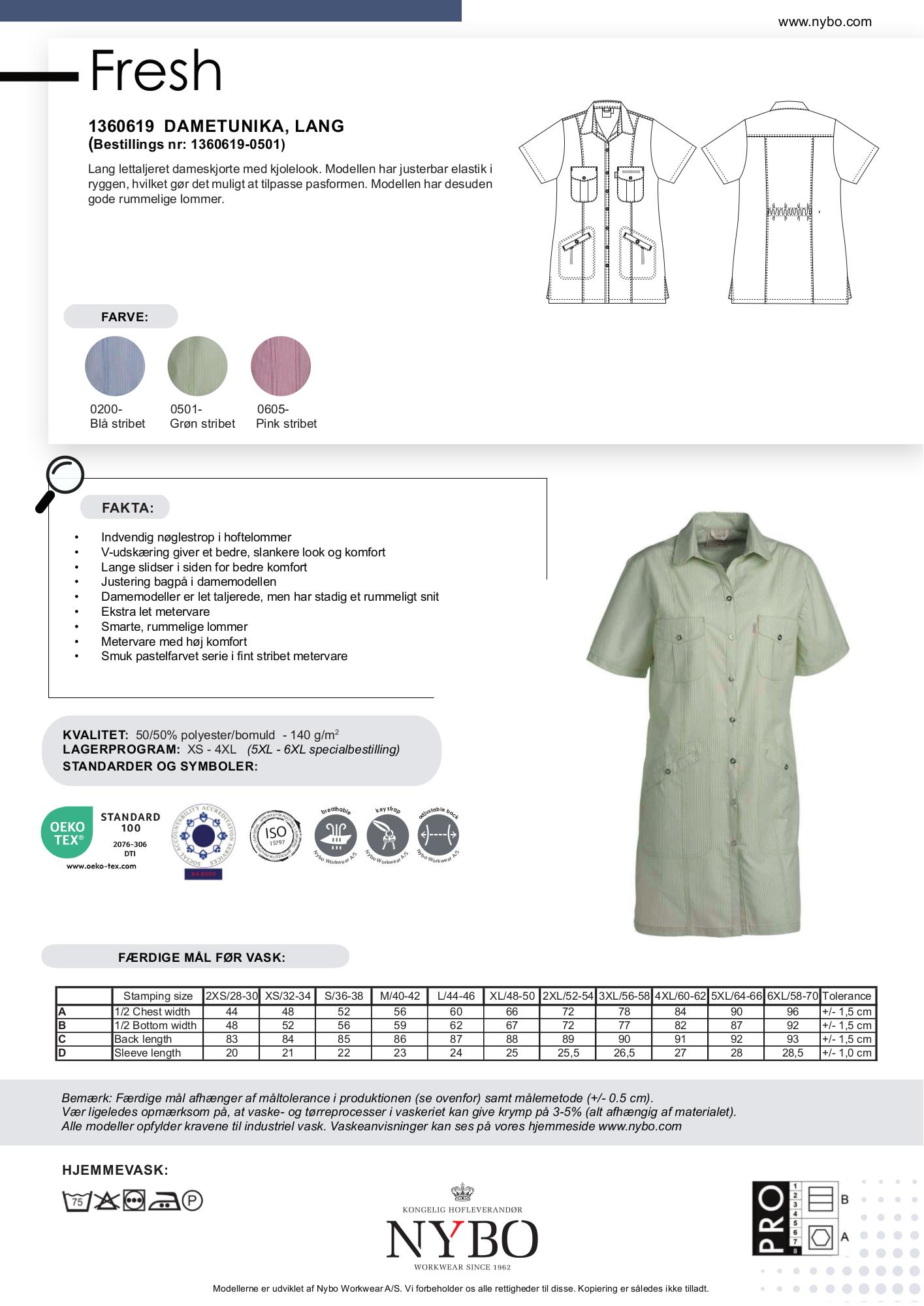 Denne dametunika fås i den stilrene lime stribet variant samt i flotte alternativer som blå stribet og pink stribet. Tøjet er lavet af en kvalitetsblanding af 50% polyester og 50% bomuld med en vægt på 140 g/m², hvilket sikrer både holdbarhed og komfort.