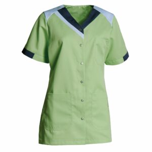 Denne stilfulde dametunika fra Nybo Workwear A/S i den smukke farvekombination af lysegrøn, navy og lyseblå tilbyder både komfort og et moderne look. Tunikaen har et flot taljeret snit, der skaber en feminin pasform, og den dækker hofterne på en elegant måde. De dækkende ærmer og langslidsede sider sikrer optimal bevægelsesfrihed, mens den formede V-hals giver et slankt og sofistikeret udtryk.