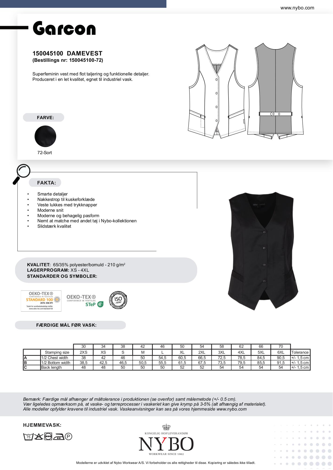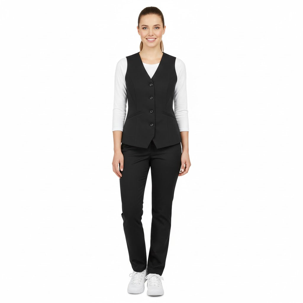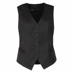 Denne damevest fås i en klassisk sort farve, der matcher enhver uniform og tilføjer et stilrent touch. Materialet består af 65/35% polyester/bomuld med en vægt på 210 g/m², hvilket gør den slidstærk, men samtidig let nok til daglig brug.