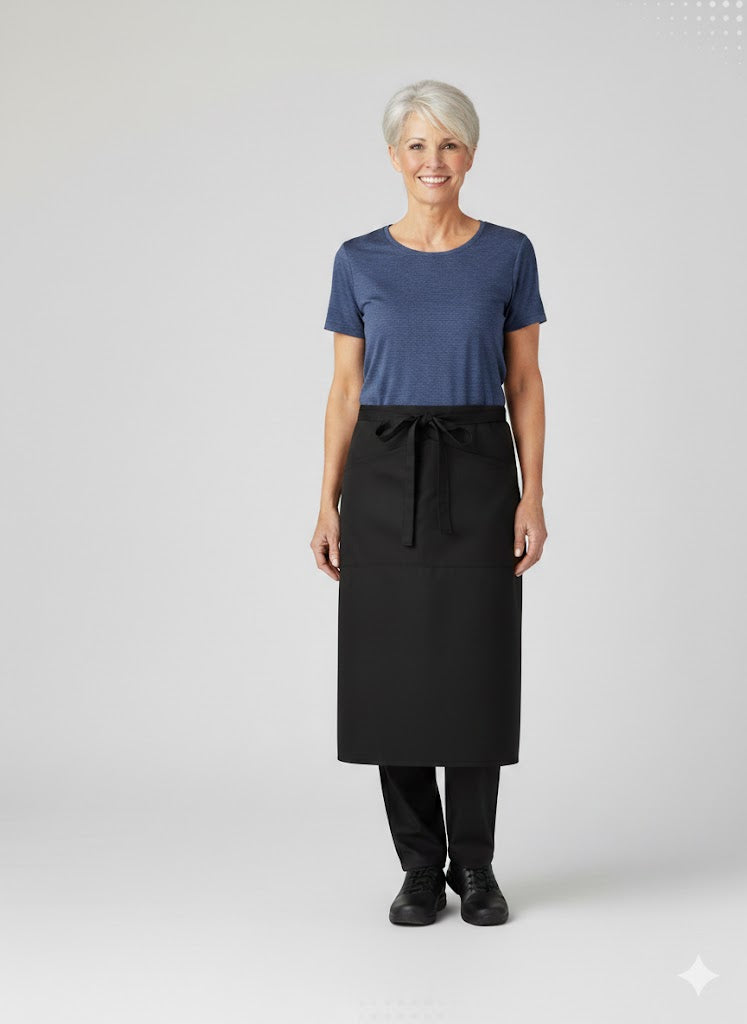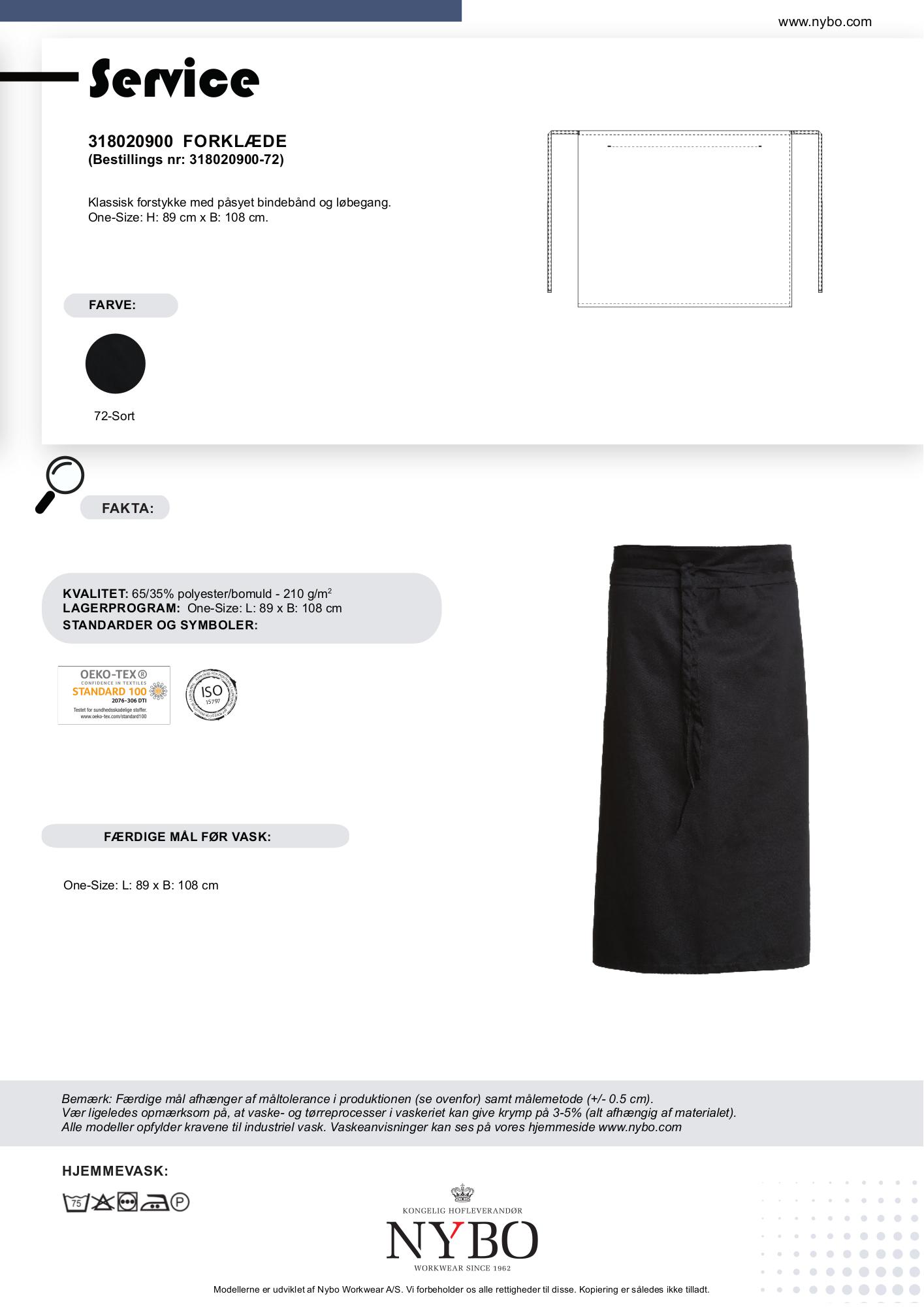 Nybo Workwear A/S præsenterer et tidløst sort unisex forklæde, skræddersyet til servicebranchen. Dette klassiske forstykke uden lommeåbning er kendetegnet ved sit enkle og funktionelle design. Med en højde på 89 cm og en bredde på 108 cm passer det perfekt som en one-size-løsning, udstyret med både påsyet bindebånd og løbegang for optimal komfort og justerbarhed.