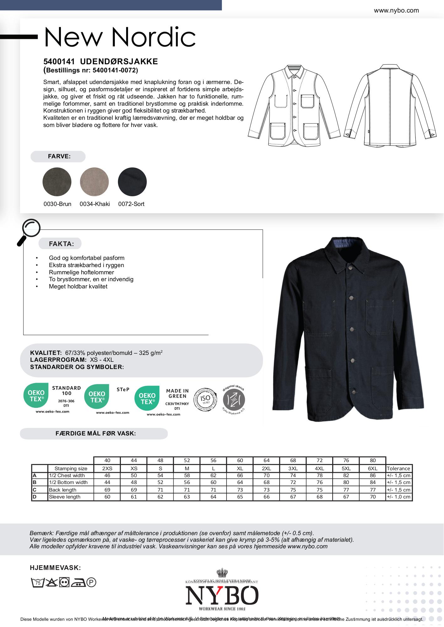New Nordic kollektionen, hvor dette produkt indgår, er udviklet med tanke på kokke og tjenere, men er velegnet til alle, der arbejder inden for gastronomi og fødevareindustrien. Denne kollektion byder på et bredt sortiment af kokkejakker, skjorter, bukser og forklæder samt denne udendørsjakke. Inspireret af den nordiske natur og kultur, kombinerer kollektionen minimalistisk æstetik med høj funktionalitet og anvender bæredygtige materialer som genanvendt polyester og økologisk bomuld. Farvepaletten er bred med muligheder som frisk hvid, khaki, brun/grønne nuancer og den dybe sort, der fremhæver det rå og rustikke look.