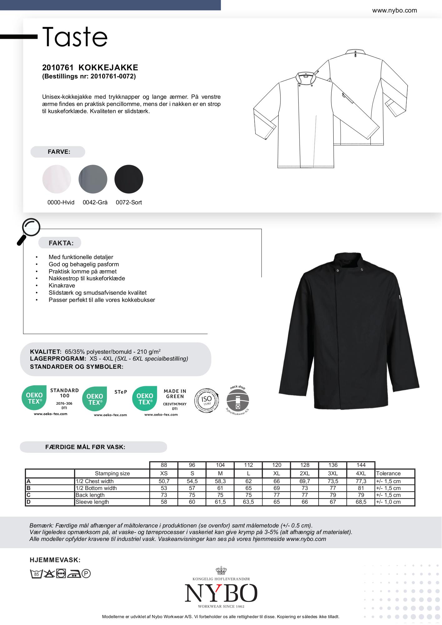 Nybo Sort Unisex Taste Kokkejakke, Lange Ærmer, Slidstærk