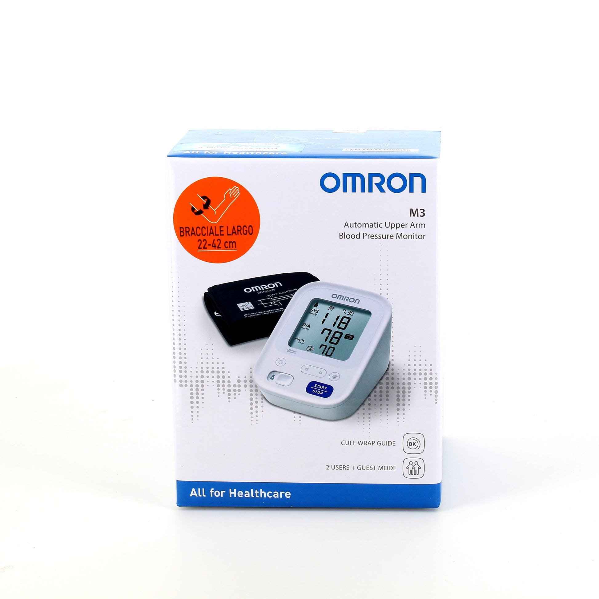 Omron M3 blodtryksapparatet er udstyret med Cuff Wrap Guide, som i displayet viser en indikator for om manchetten sidder korrekt, derved sikres det, at manchetten hverken sidder for løs eller for fast, og det er med til at uanset hvordan manchetten placeres på overarmen udfører Omron M3 blodtryksapparatet en præcis måling.