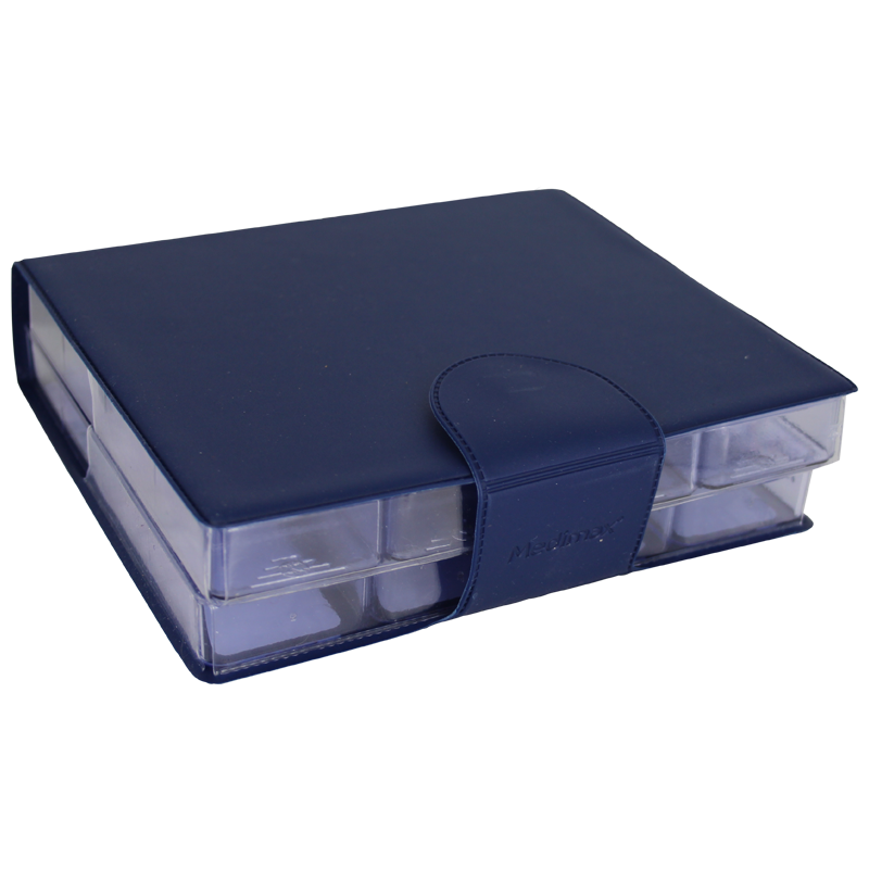 Medimax Pille æske er et ugesæt, med store rum og 8 løse æsker. Hvert lille rum måler 3,5cm x 3,5cm.