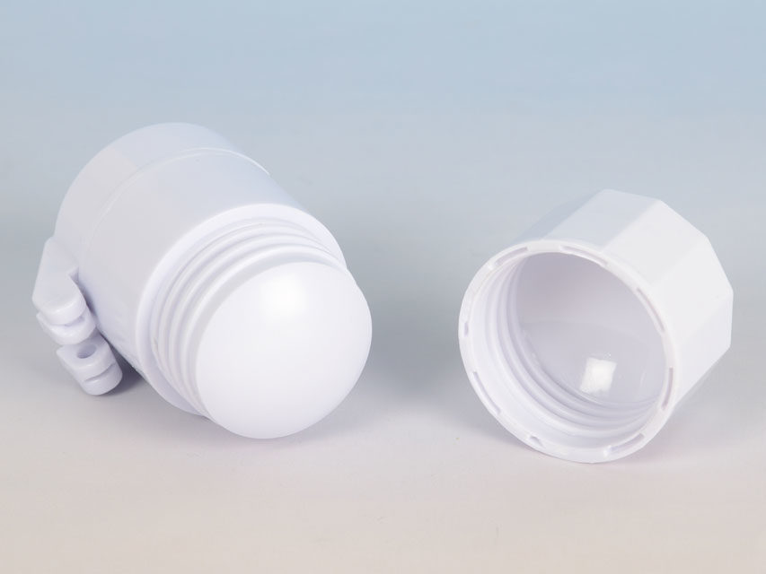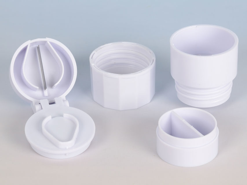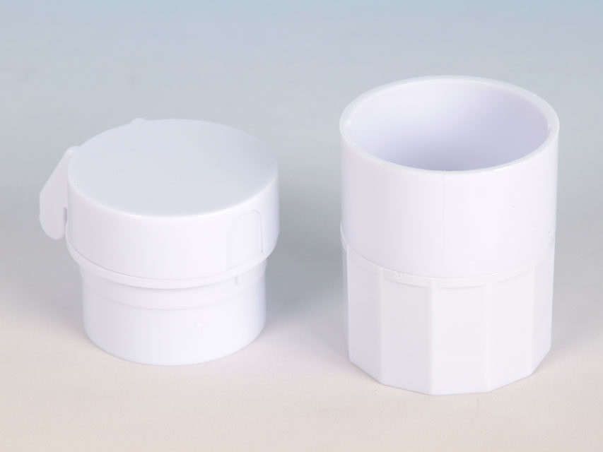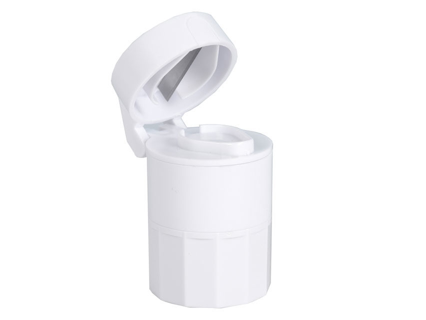 Lille rund handy tabletdeler i hvid plastik, med kniv i toppen, og med tabletknuser i bunden.