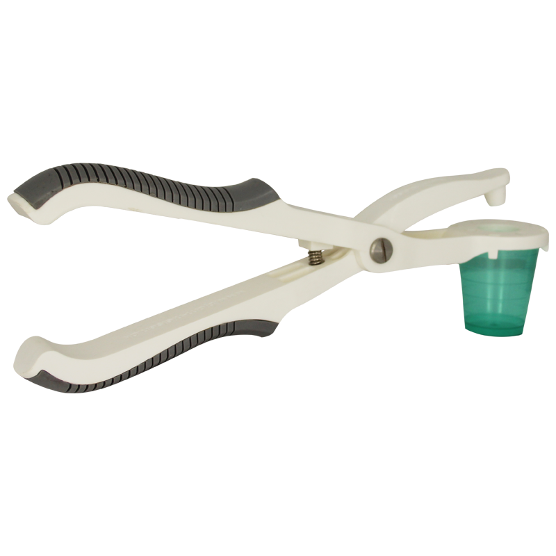 Tangen er både til venstre og højre hånd, kan bruges af en hånd. Placer den runde del under blisterpakken, med dækfolien nedad, tryk håndtagene sammen, og pillen falder ud.