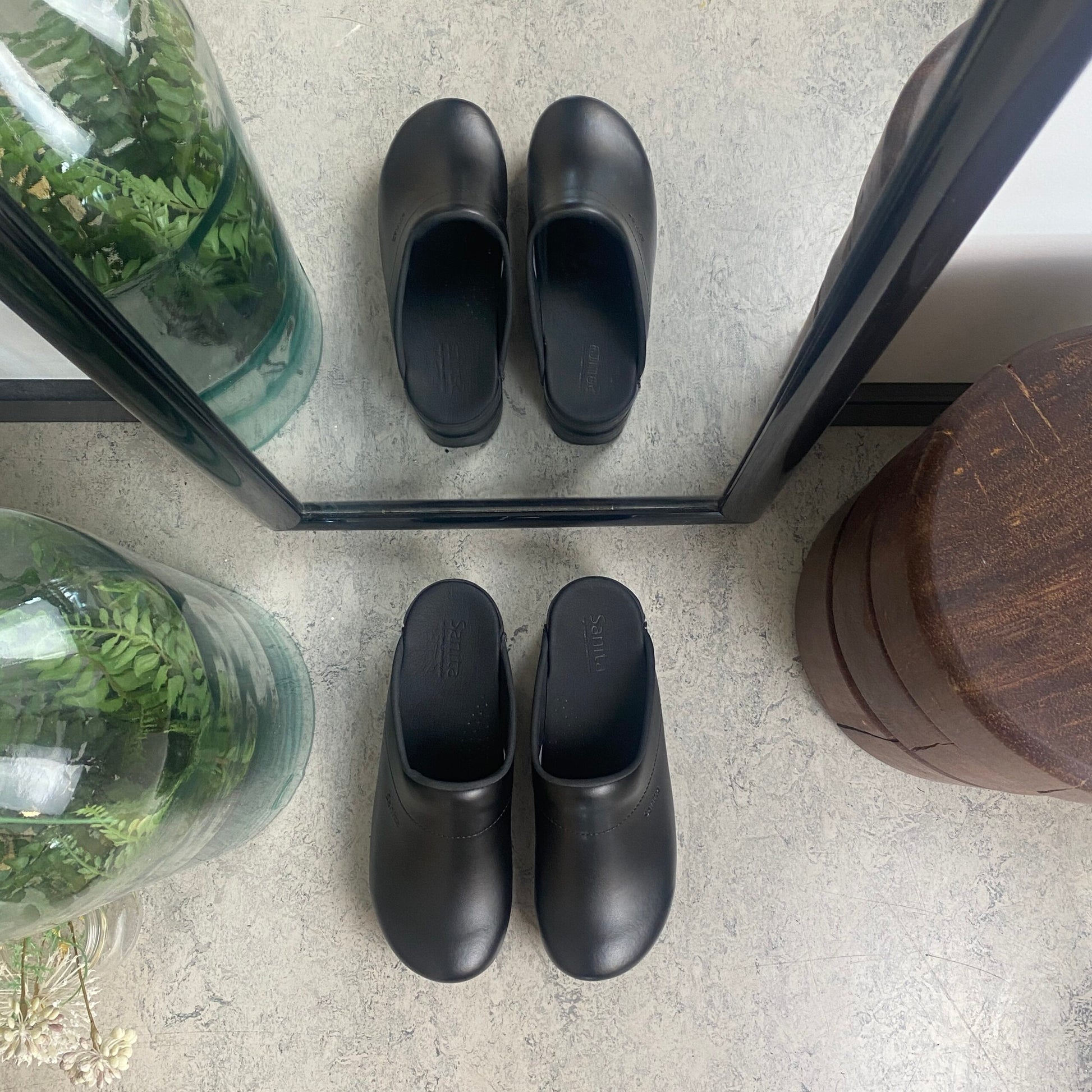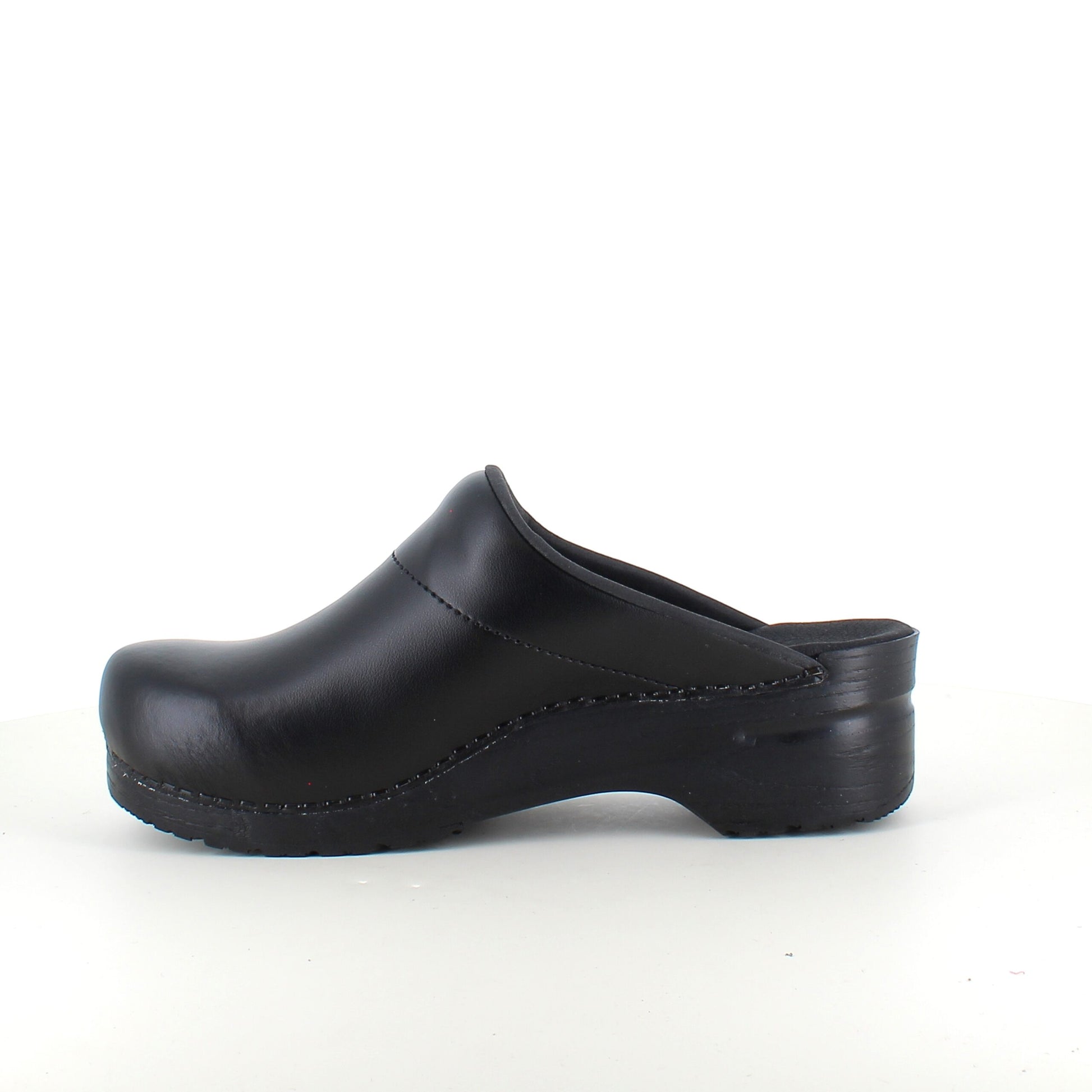 Denne træsko er fremstillet i sort glat læder, som er let at rengøre og meget slidstærkt.