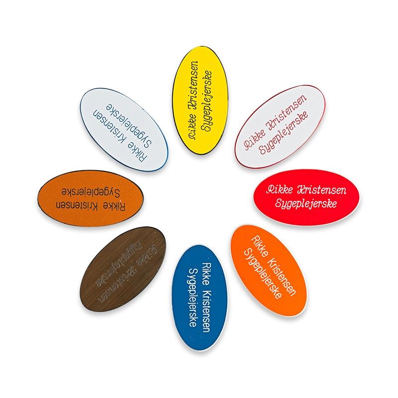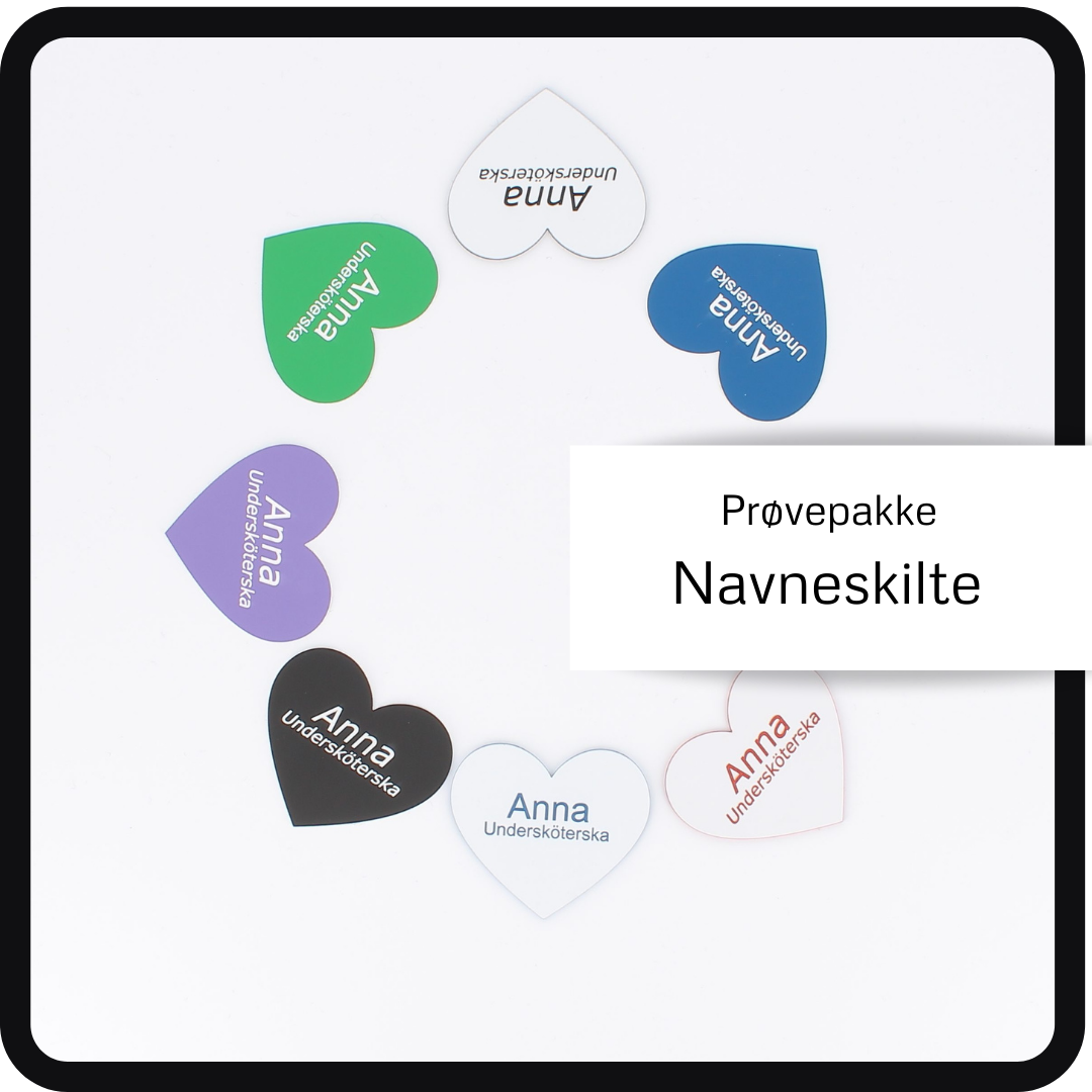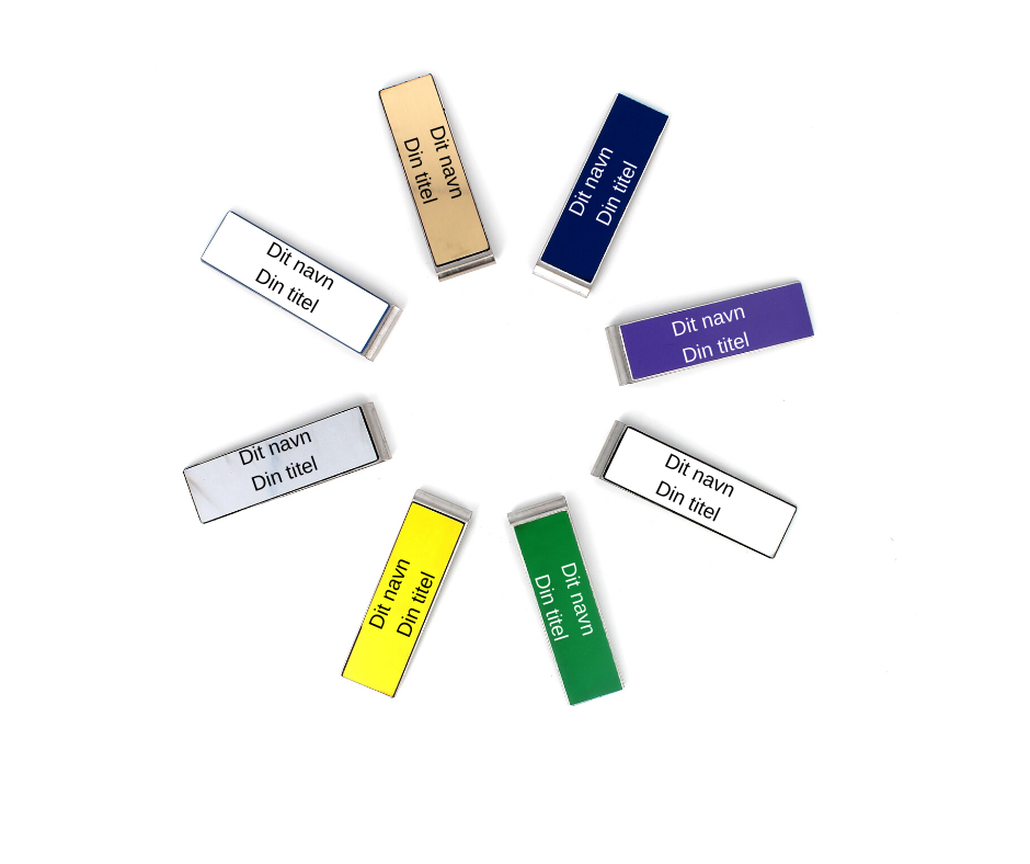 Du bestiller en prøvepakke og får tilsendt vores bud på de mest anvendte navneskilte i din branche samt et navneskilt med logo på.