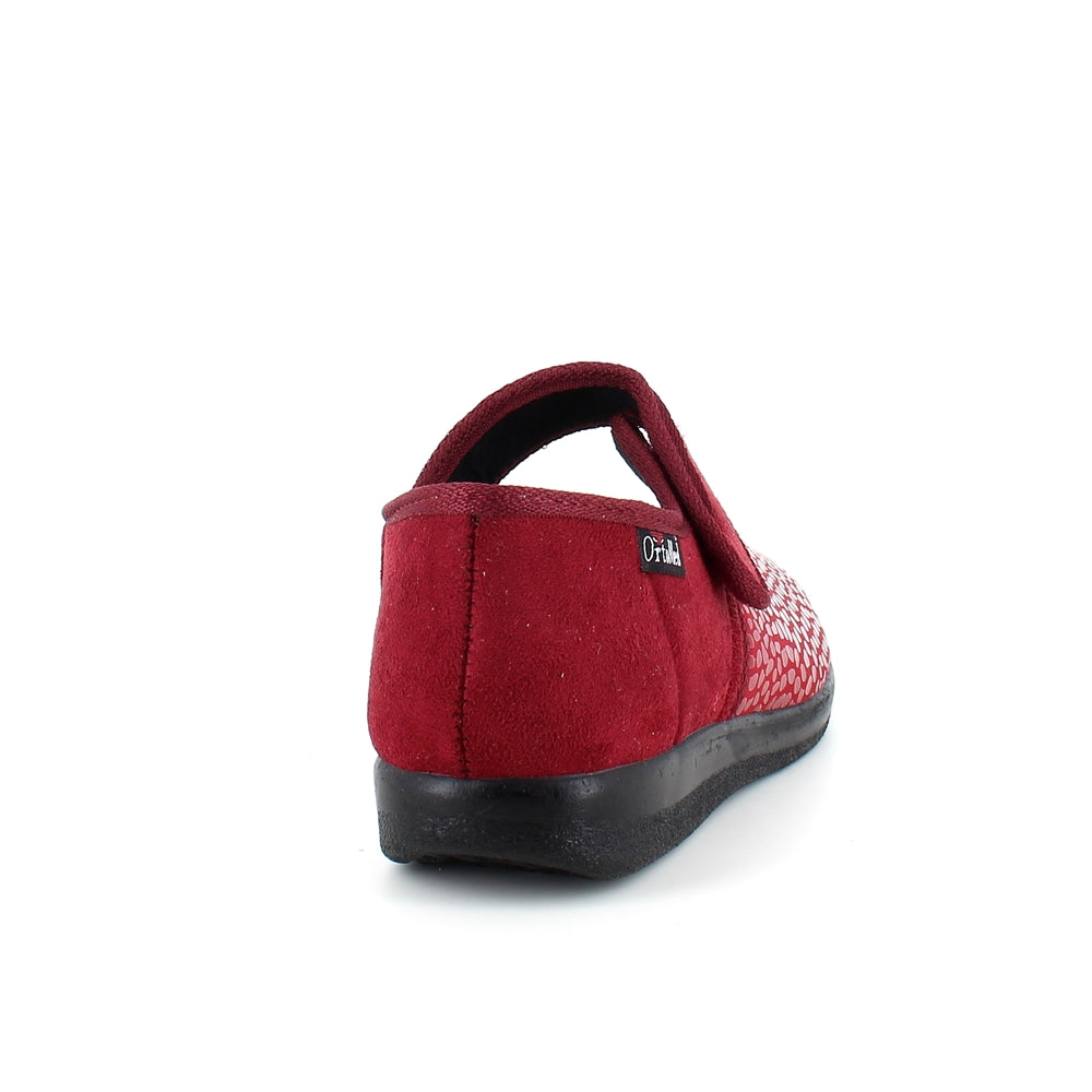 Bred ortopædisk sko i rød med velcro omkring ankel.