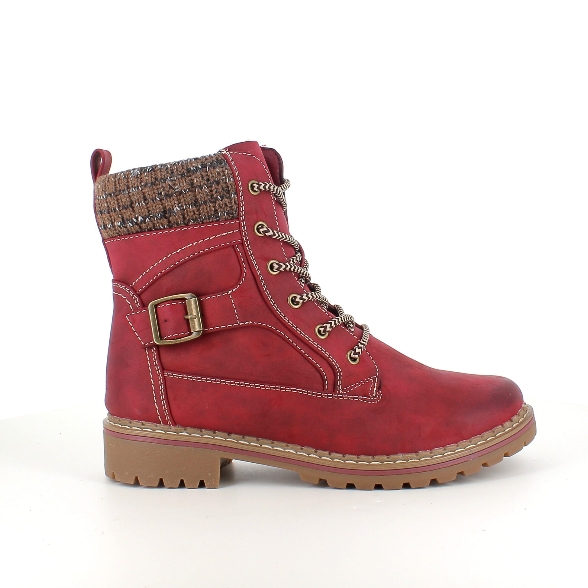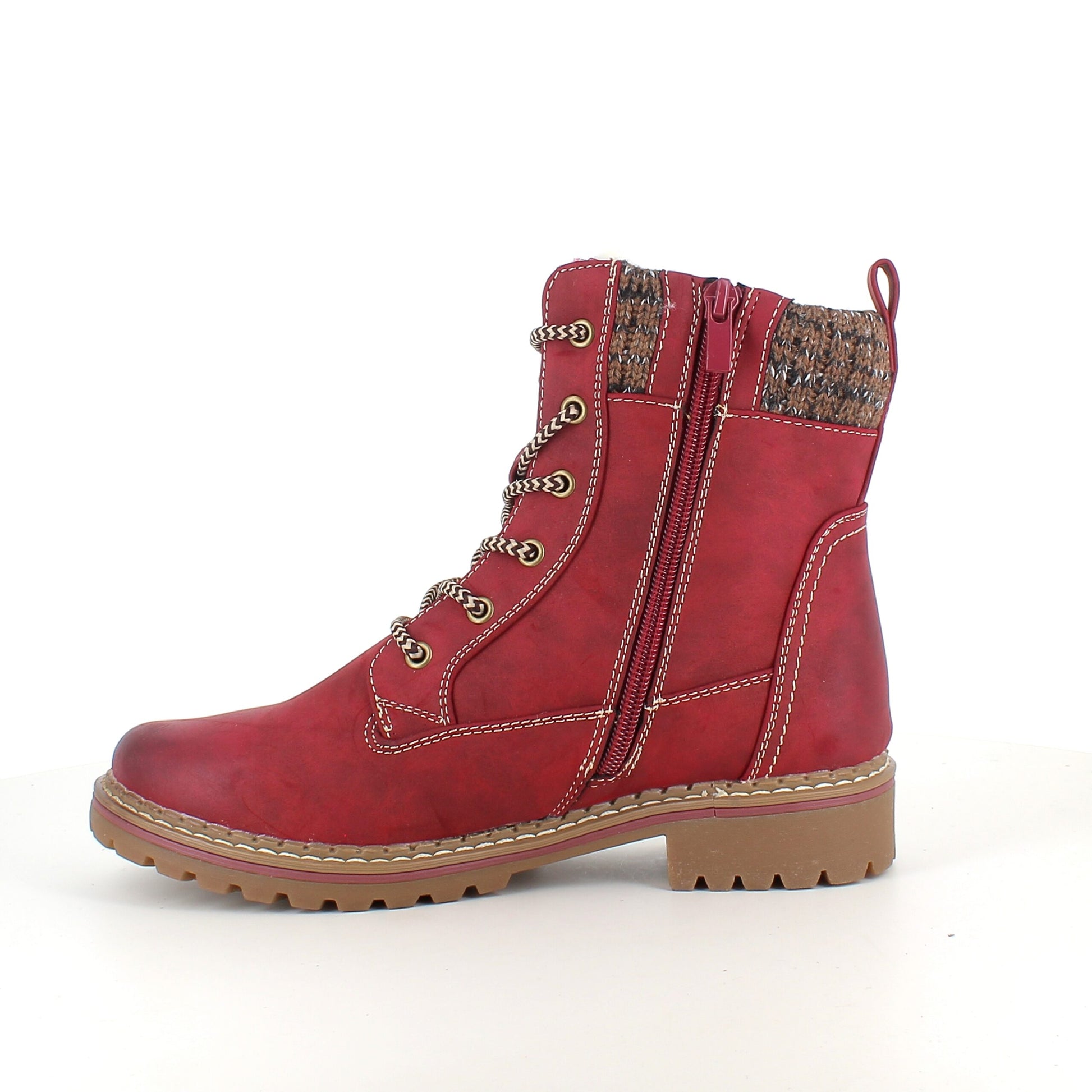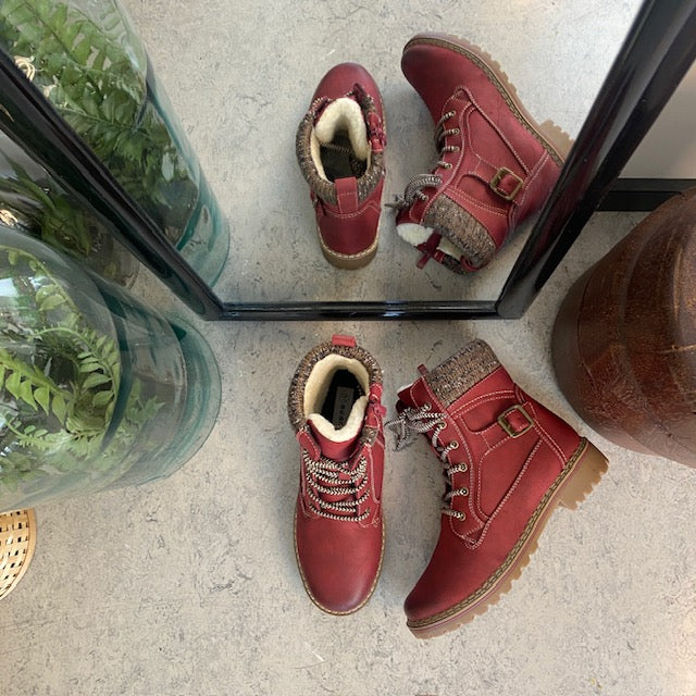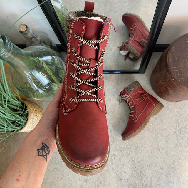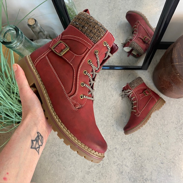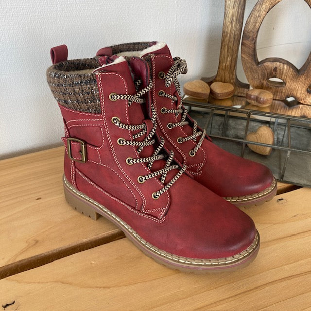 Rød damestøvle med snørebånd, lynlås og varmt for – dekorativ spænde og TPR-sål
