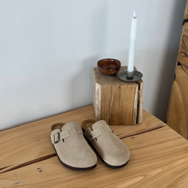 Den er designet med en elegant spænde detalje på fronten og en justerbar rem over forfoden, der sikrer optimal pasform.