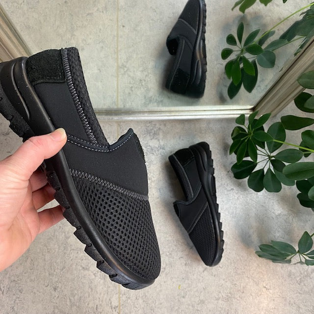 Sort fleksibel sko med skridhæmmende såler