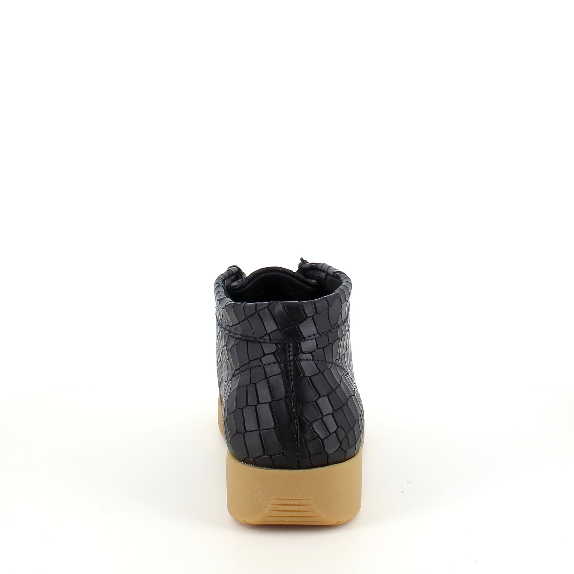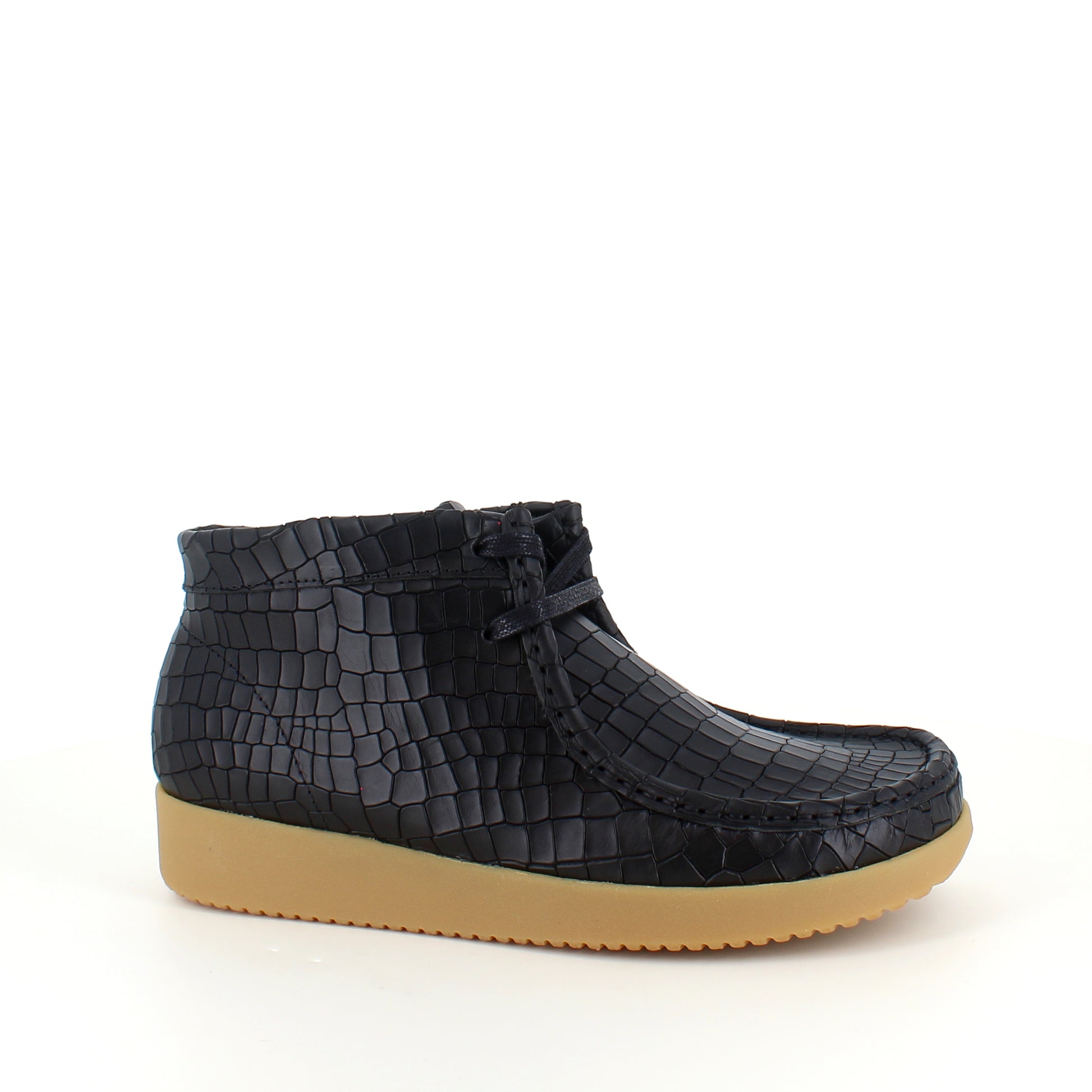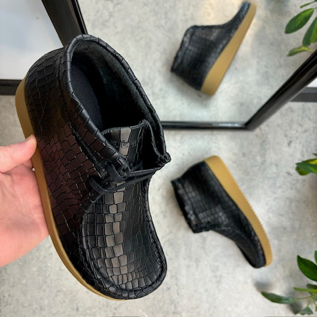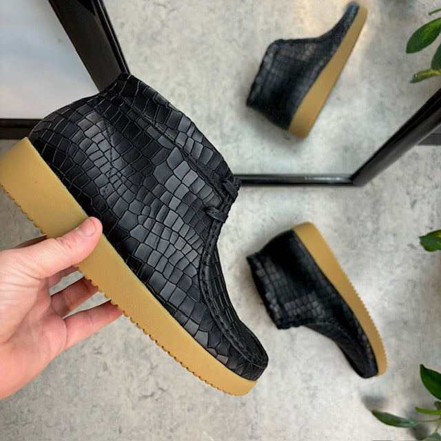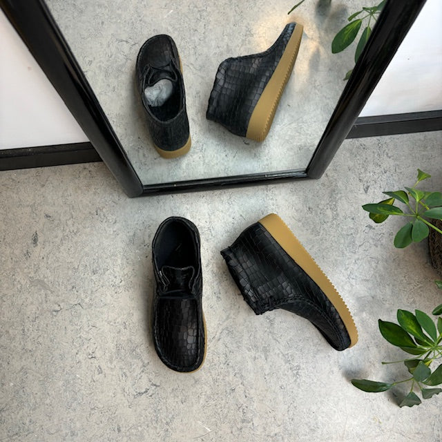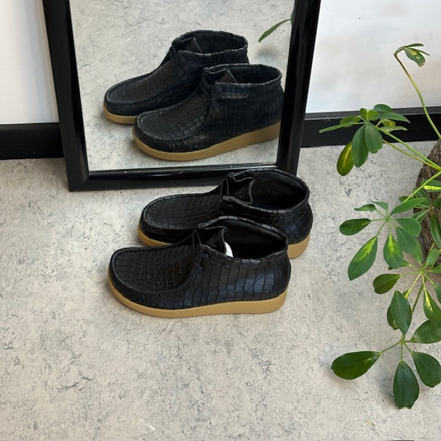 Sort krokodillemønstret støvlet fra Nature er en moderne og ergonomisk sko lavet af læder.